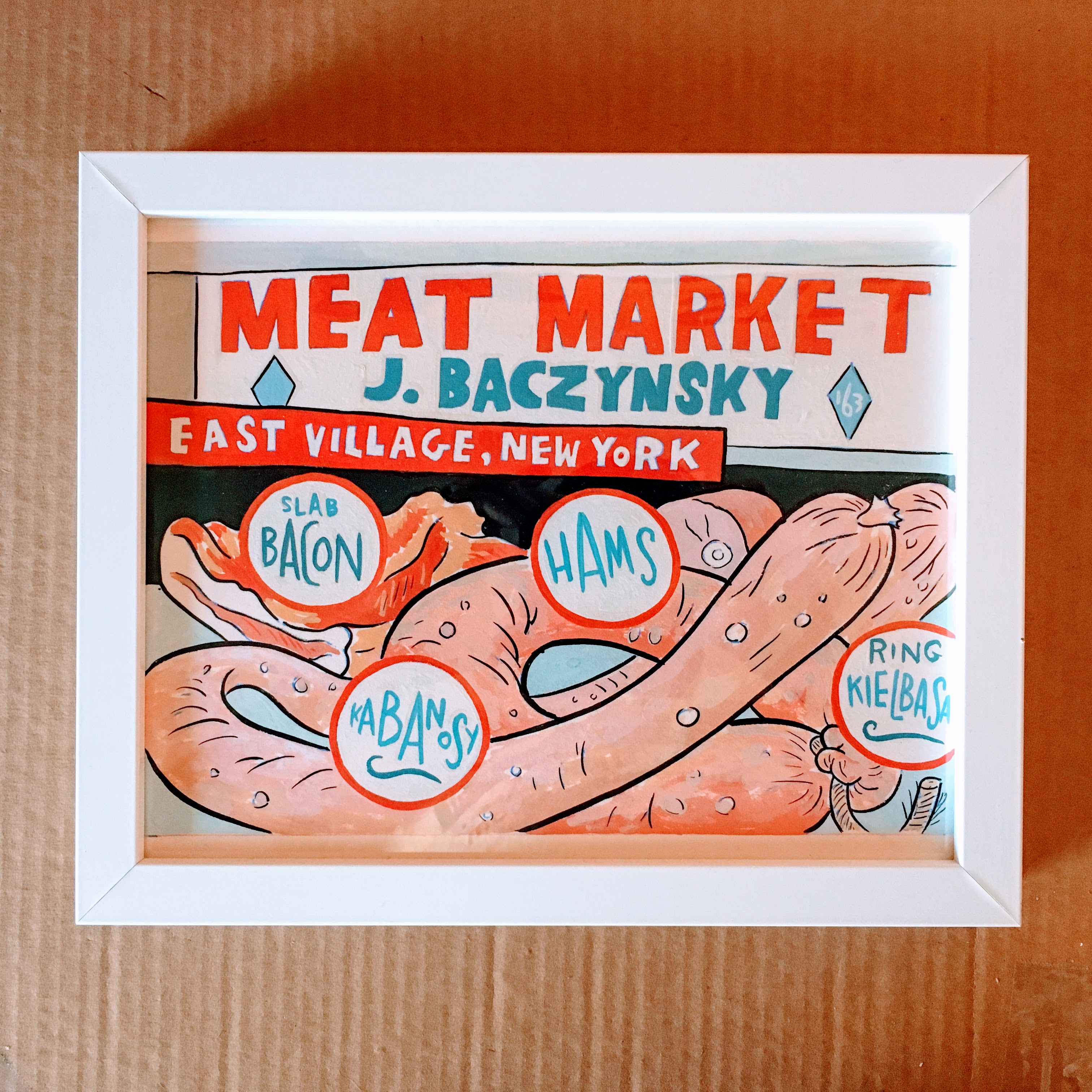 Original Artwork, 2012; gouache and ink, 8" x 10", framed. Legendary lower east side NYC Kielbasa shop, originally for Serious Eats.