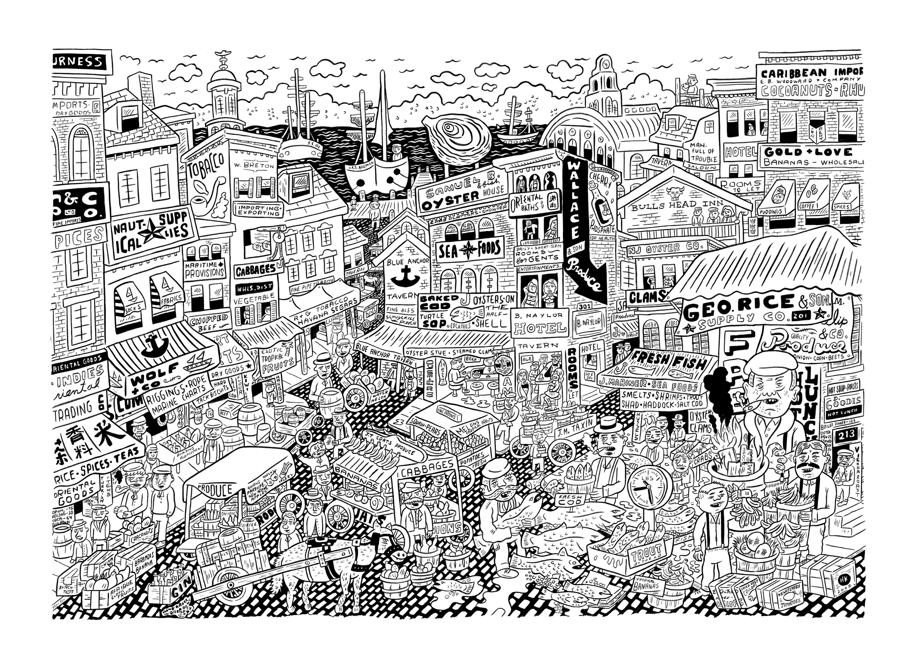 Real & Imagined Dock Street in the 1800’s - originally for "Hucksters" exhibit at the Philadelphia Independende Seaport Museum. ** PRINTS of this piece are likely still available at the museum gift shop **