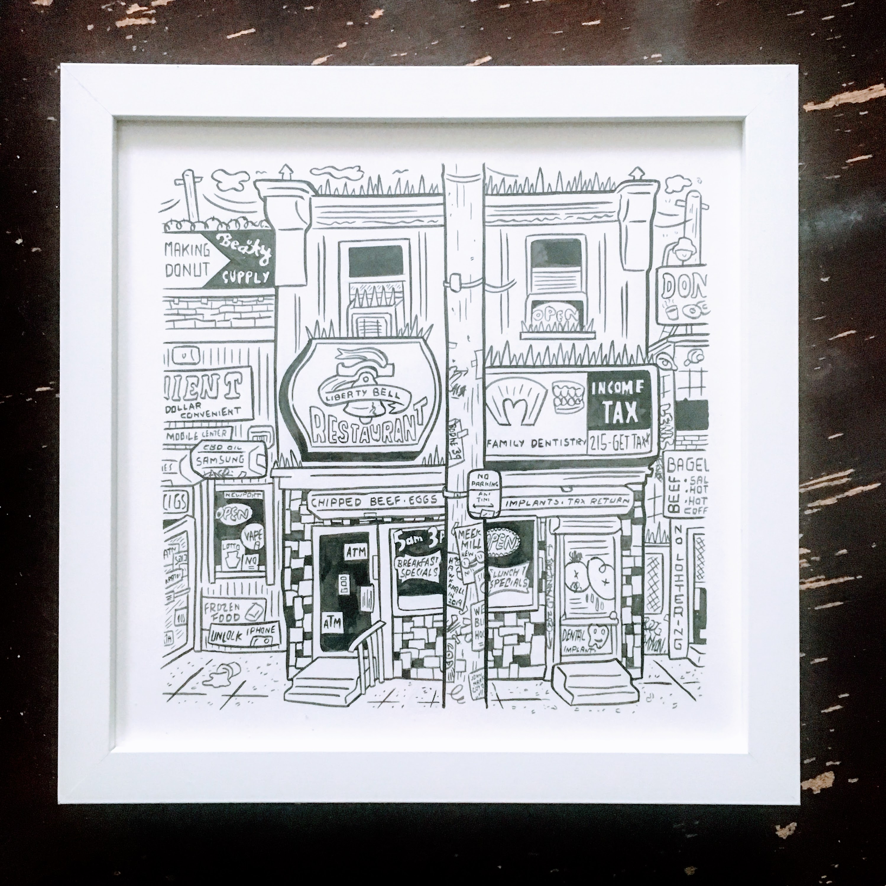 2019, 9” x 9, Original Art, Ink on Arches Paper; framed in white.