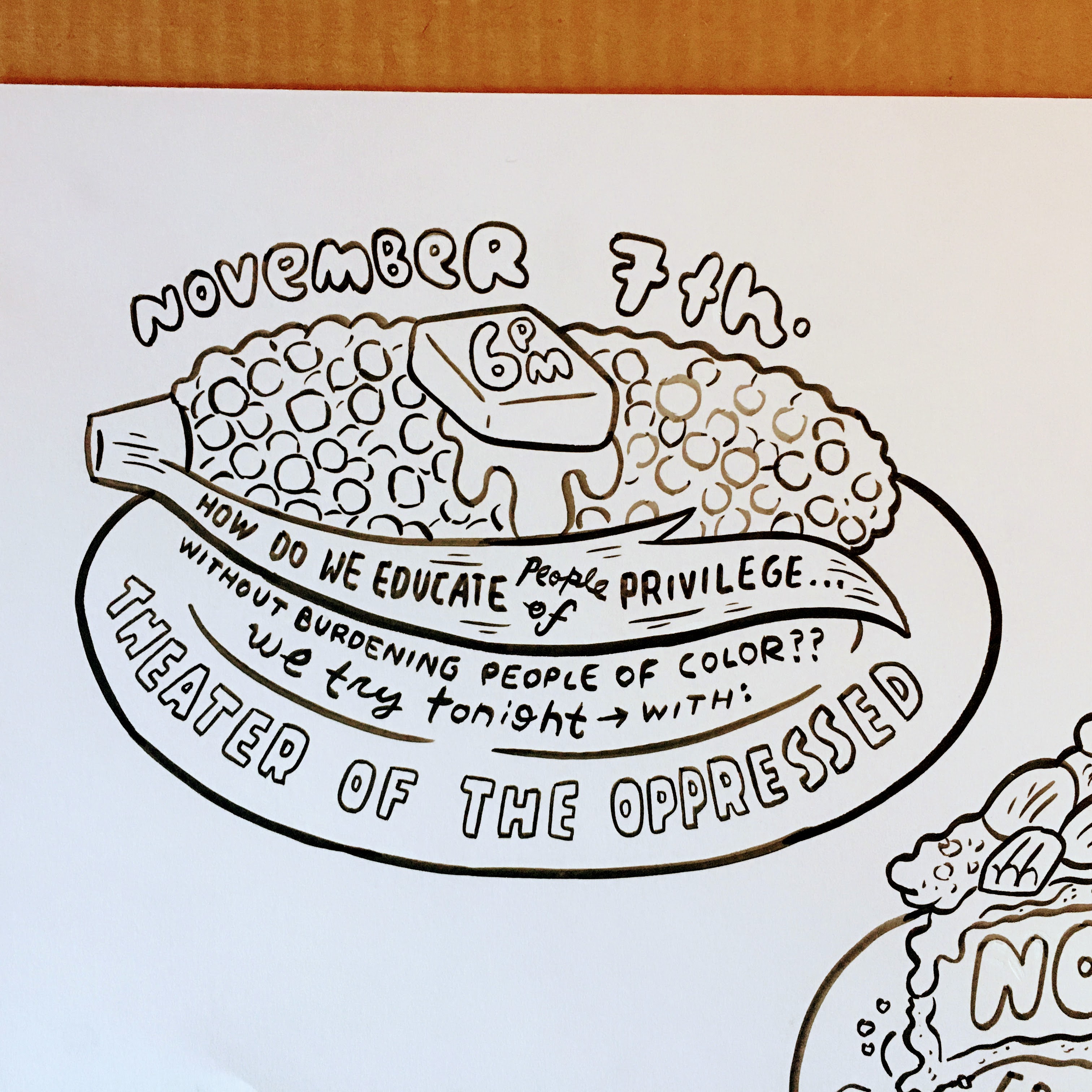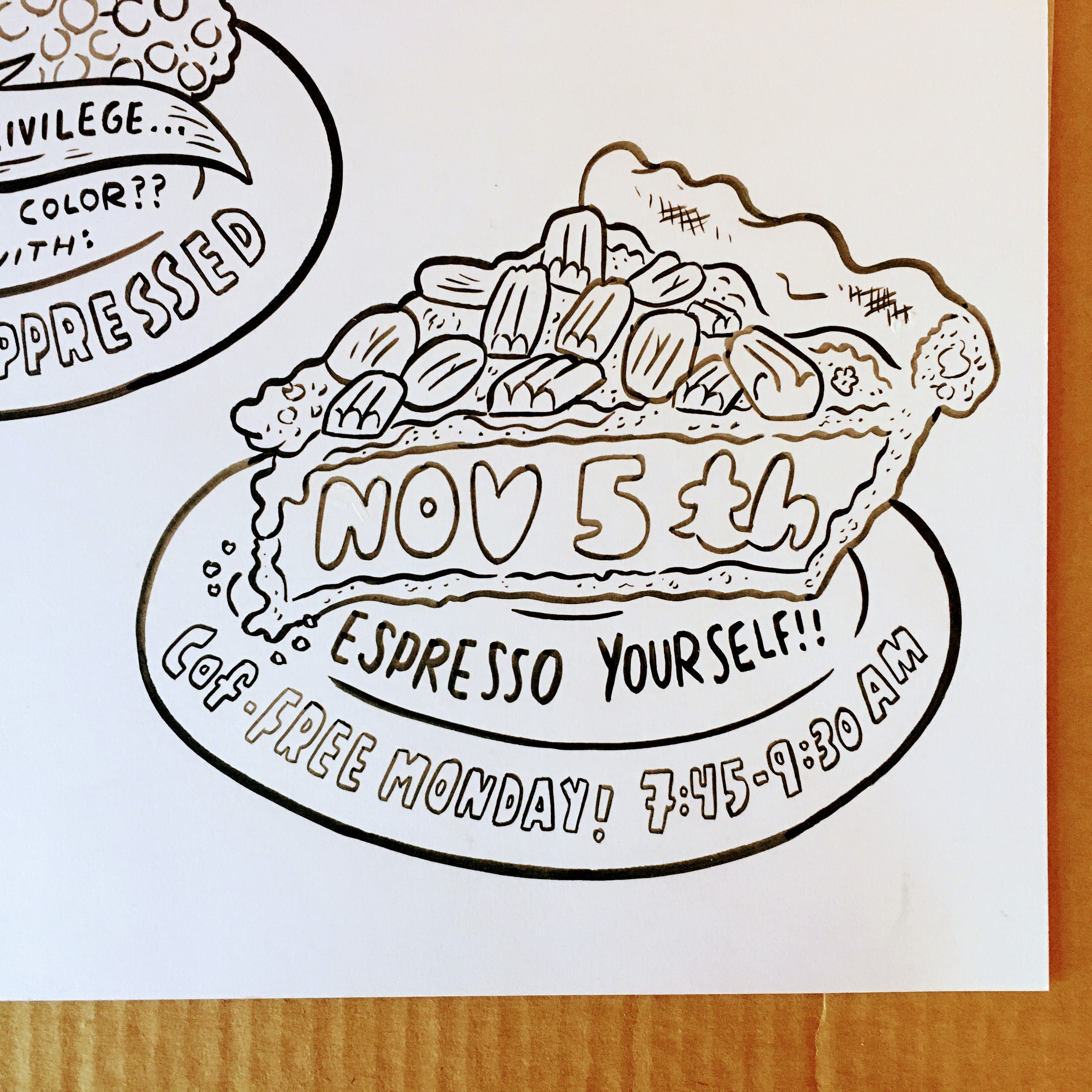 Original artwork for two spot illustrations that were part of a Tyler School Of Art calendar, including social justice corn and pecan pie.