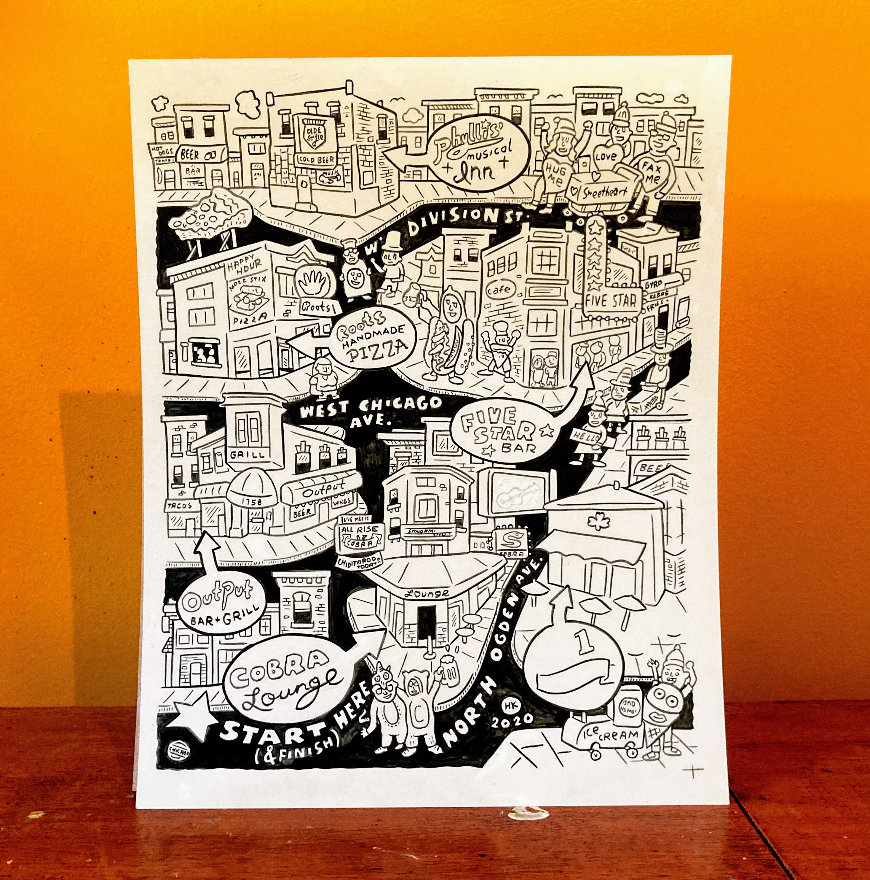 Original art, ink on bristol board, 11" x 14". Map-Illustration for Chicago Magazine on their crazy annual "Chitidarod" drunken, costumed shopping-cart Christmas race.