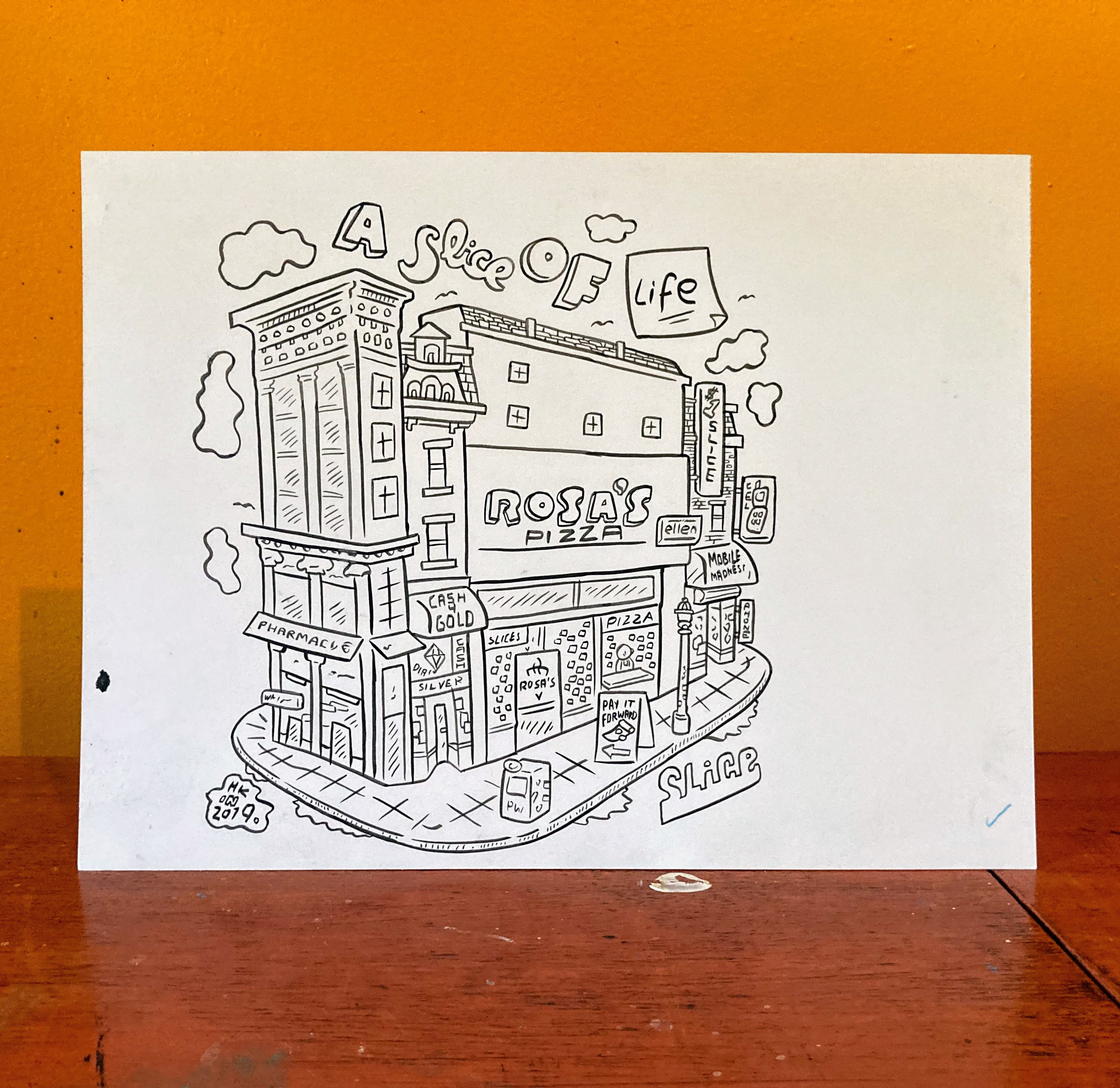 Original art, ink on bristol board, 9" x 12". Original line art from an Illustration for SLICE pizza app, of Philadelphia's (now-closed) "pay it forward" pizza spot.