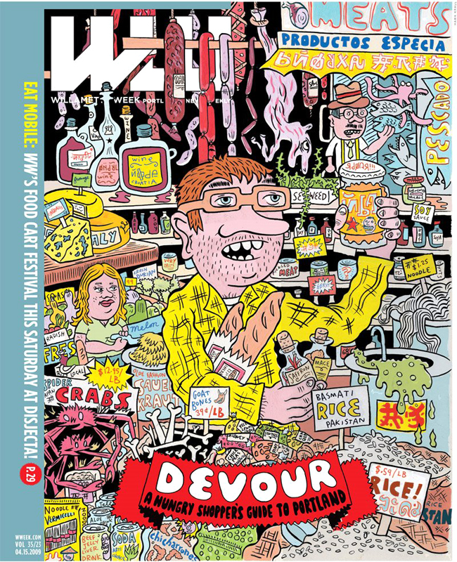 Cover illustration for "Devour" food issue of Portland's Willamette Week newspaper from 2009. This was one of my first food-related published illustrations, chock full of crazy details, highlighting Portland's eclectic markets.