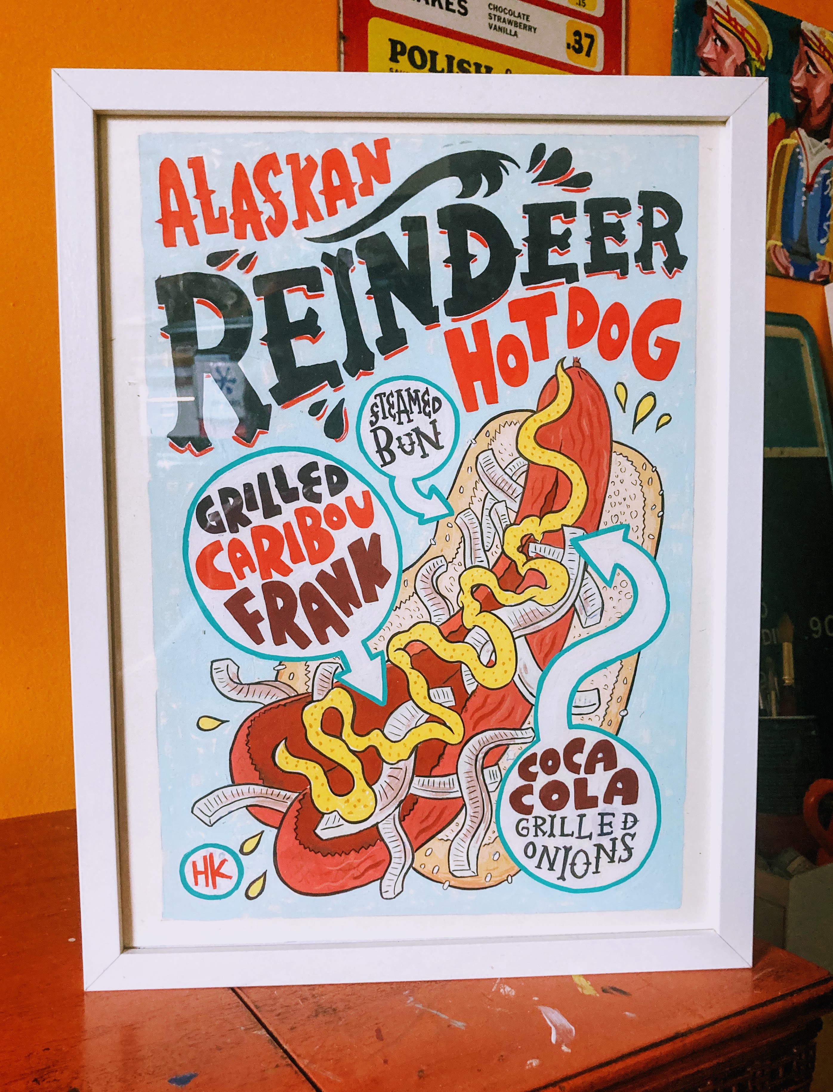 Original gouache painting of the famous Alaskan reindeer dog! Popularized at carts in downtown Anchorage, often topped with cream-cheese from a caulk dispenser - possibly the inspiration for Seattle's Cream Cheese hot dog, or vice versa. The dogs are made with Caribou, and widely available these days via mailorder.