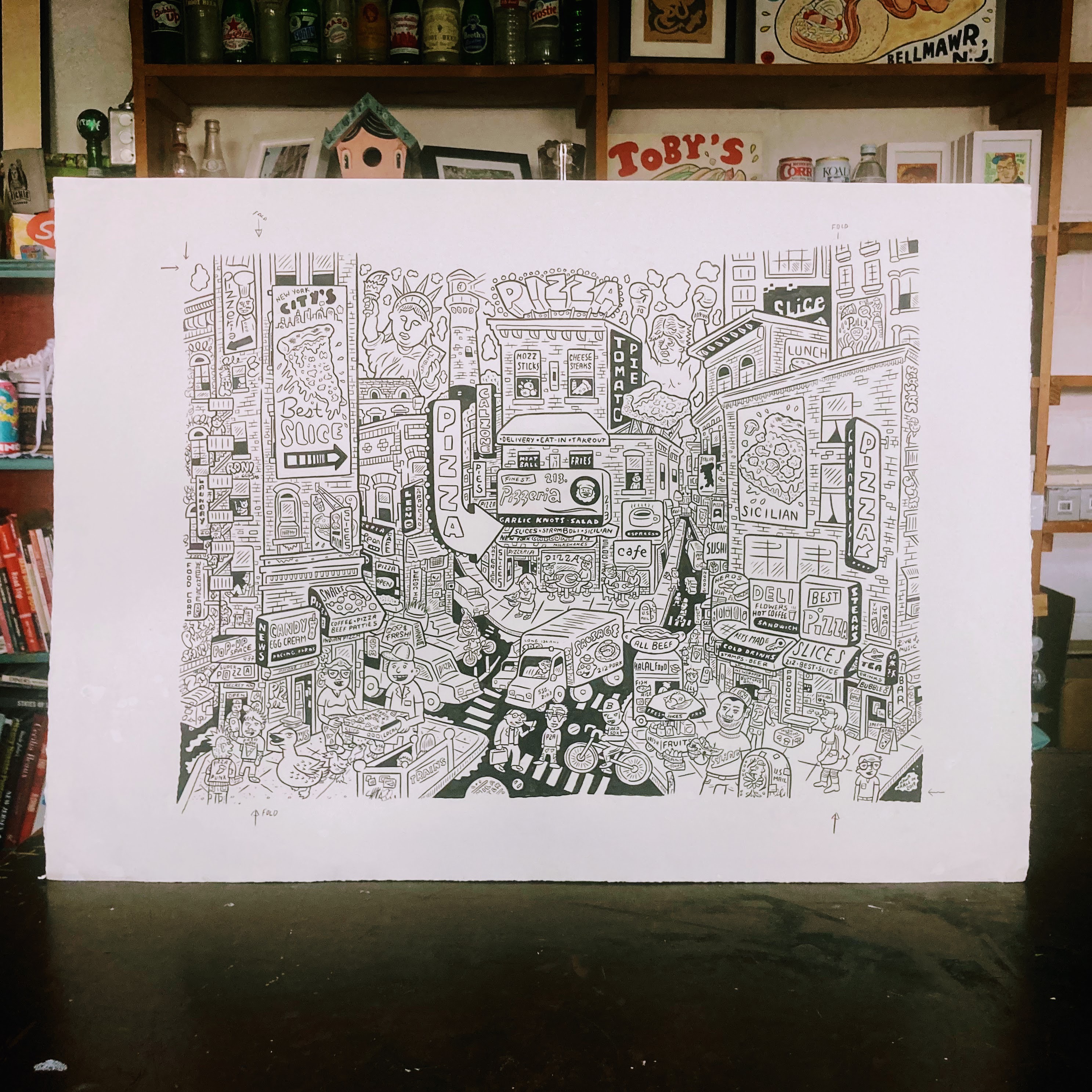 A Philadelphia / NYC mashup design with nods to both cities. Super super fun piece with tons of great detail. One (unused) pizza box included with art purchase!