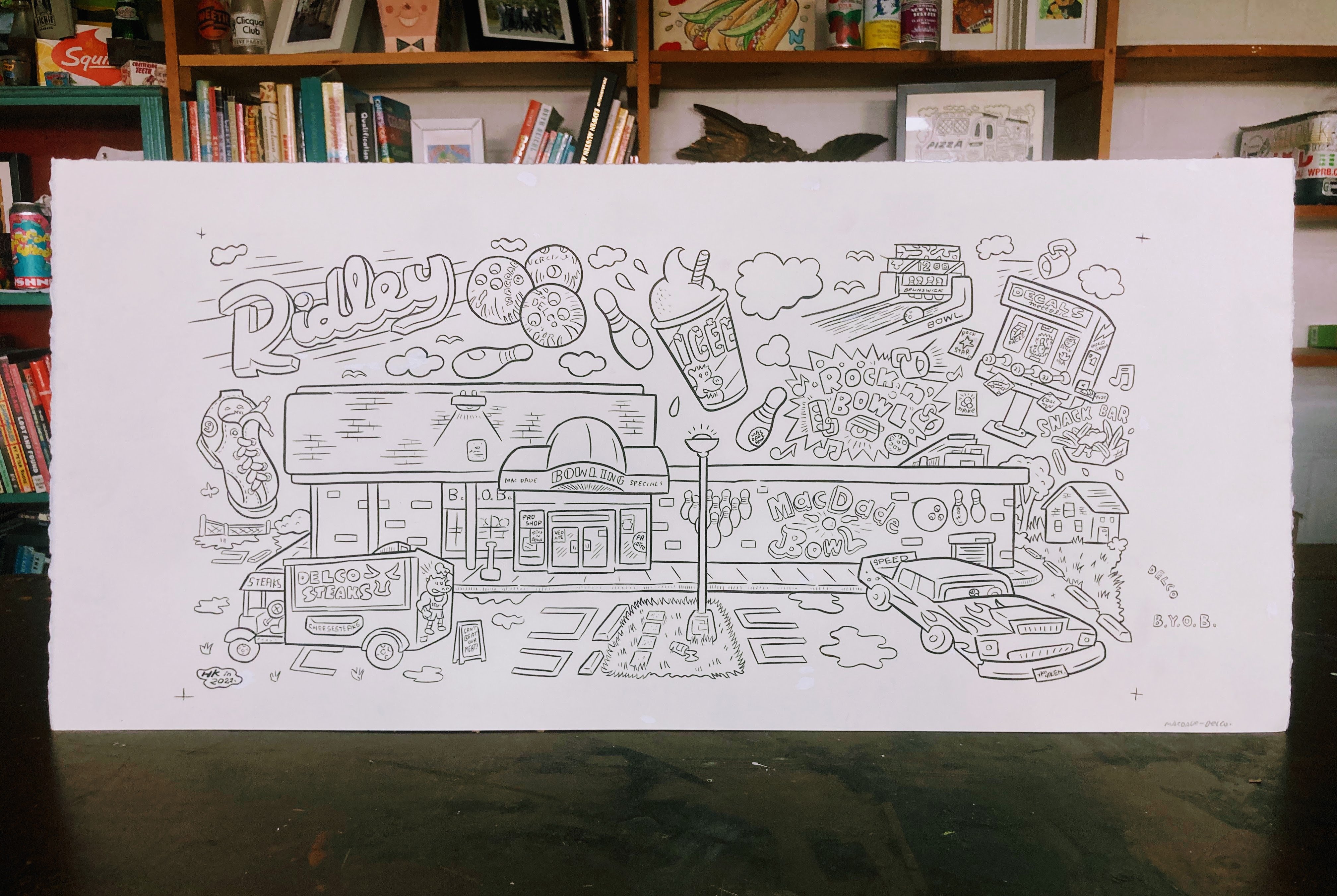 From a series of 18 Delco neighborhood illustrations (not all will be for sale, but a lot of them) - this piece featuring the funky bowling alley in Ridley Park.