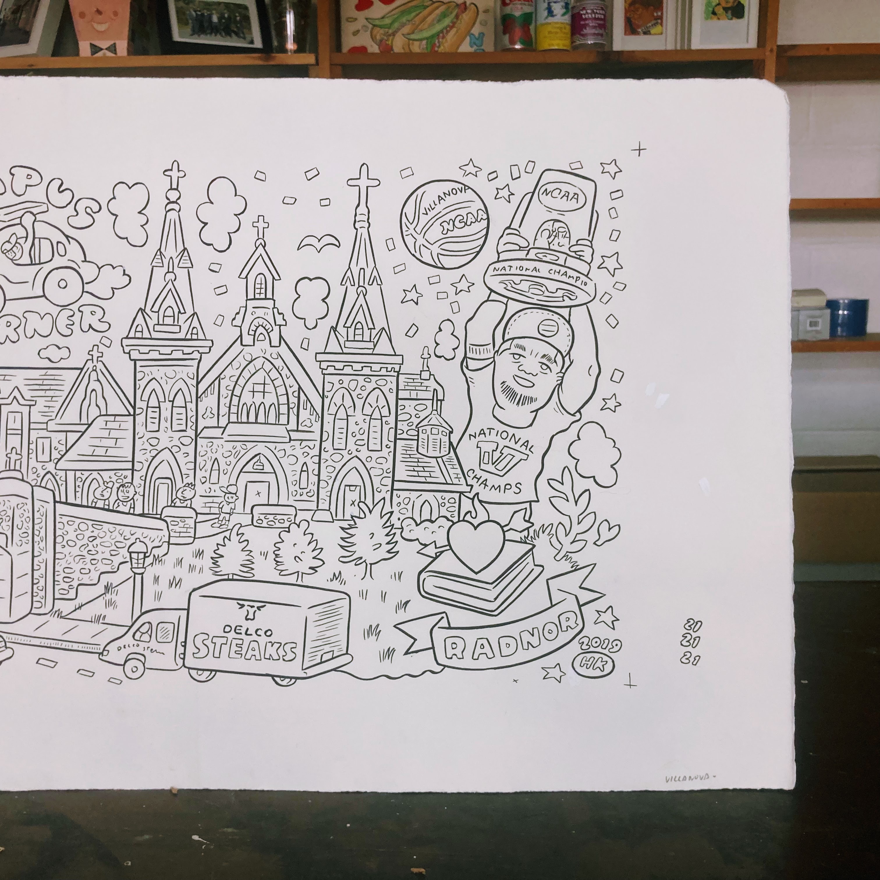 From a series of 18 Delco neighborhood illustrations (not all will be for sale, but a lot of them) - this piece features Villanova Campus.