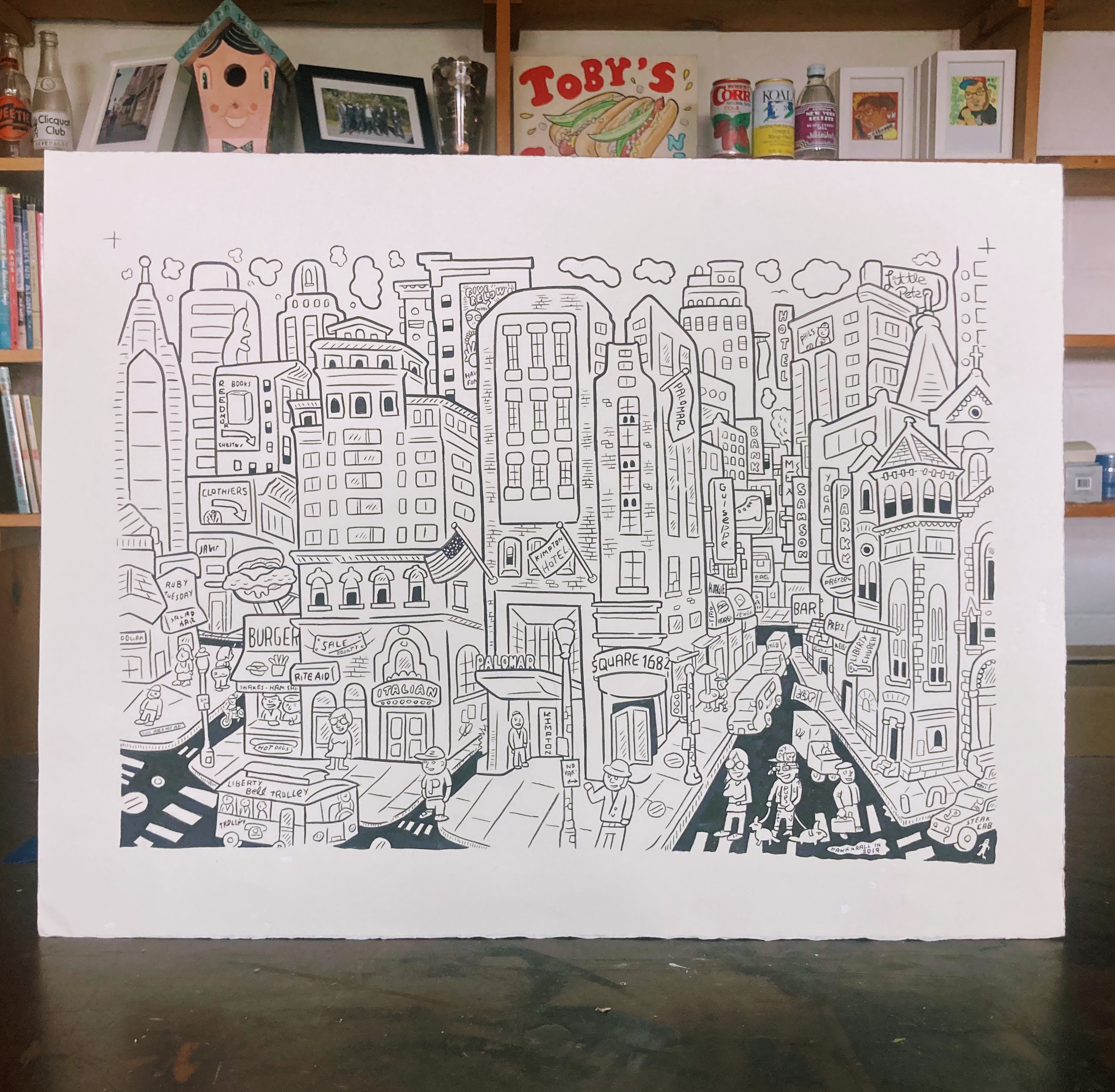 17th Street in Philadelphia, center city / Rittenhouse area cityscape drawing. Originally for a Palomar Hotel postcard.