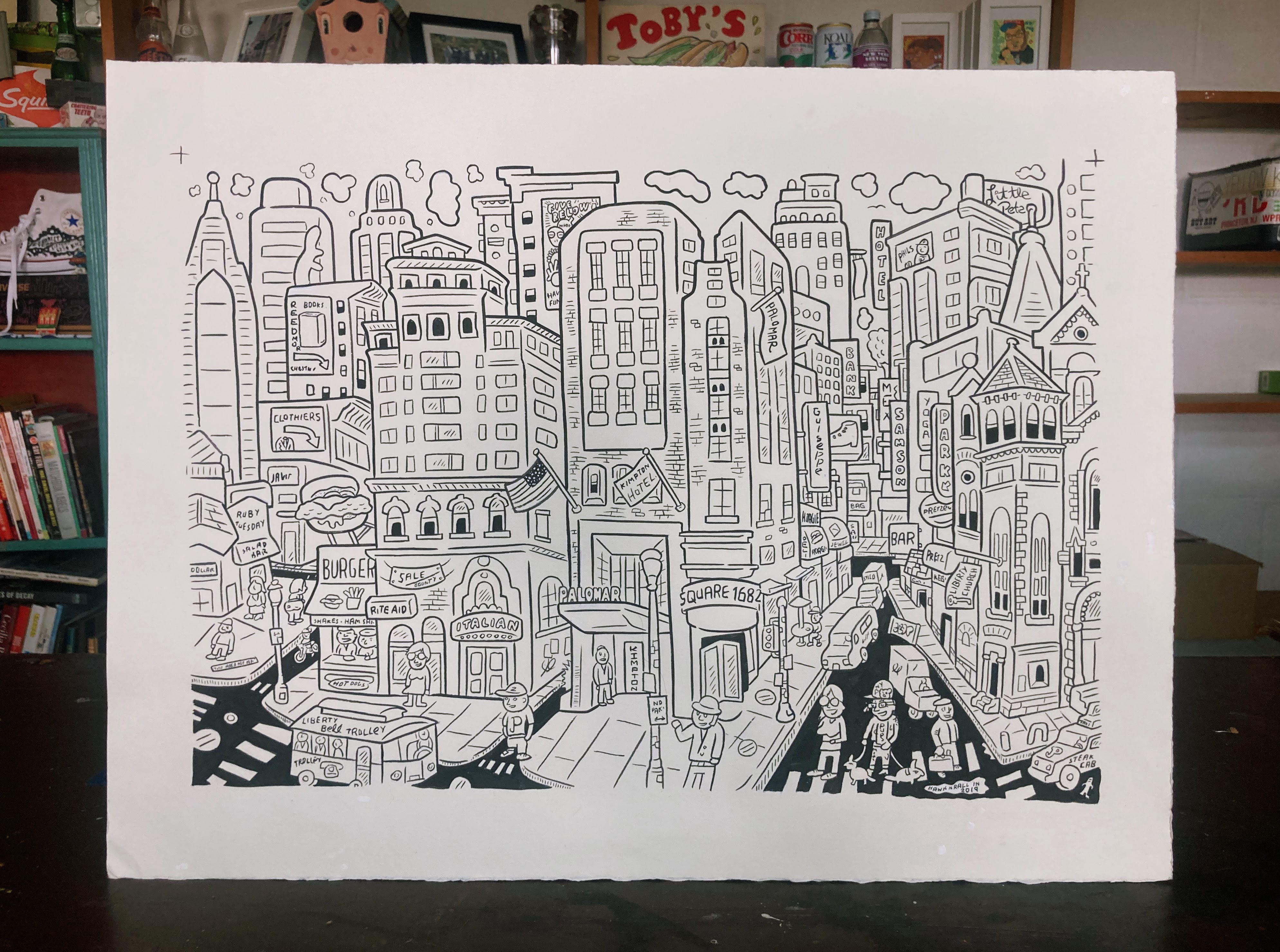 11" x 16" artwork on 14.5" x 19" paper, black & white.