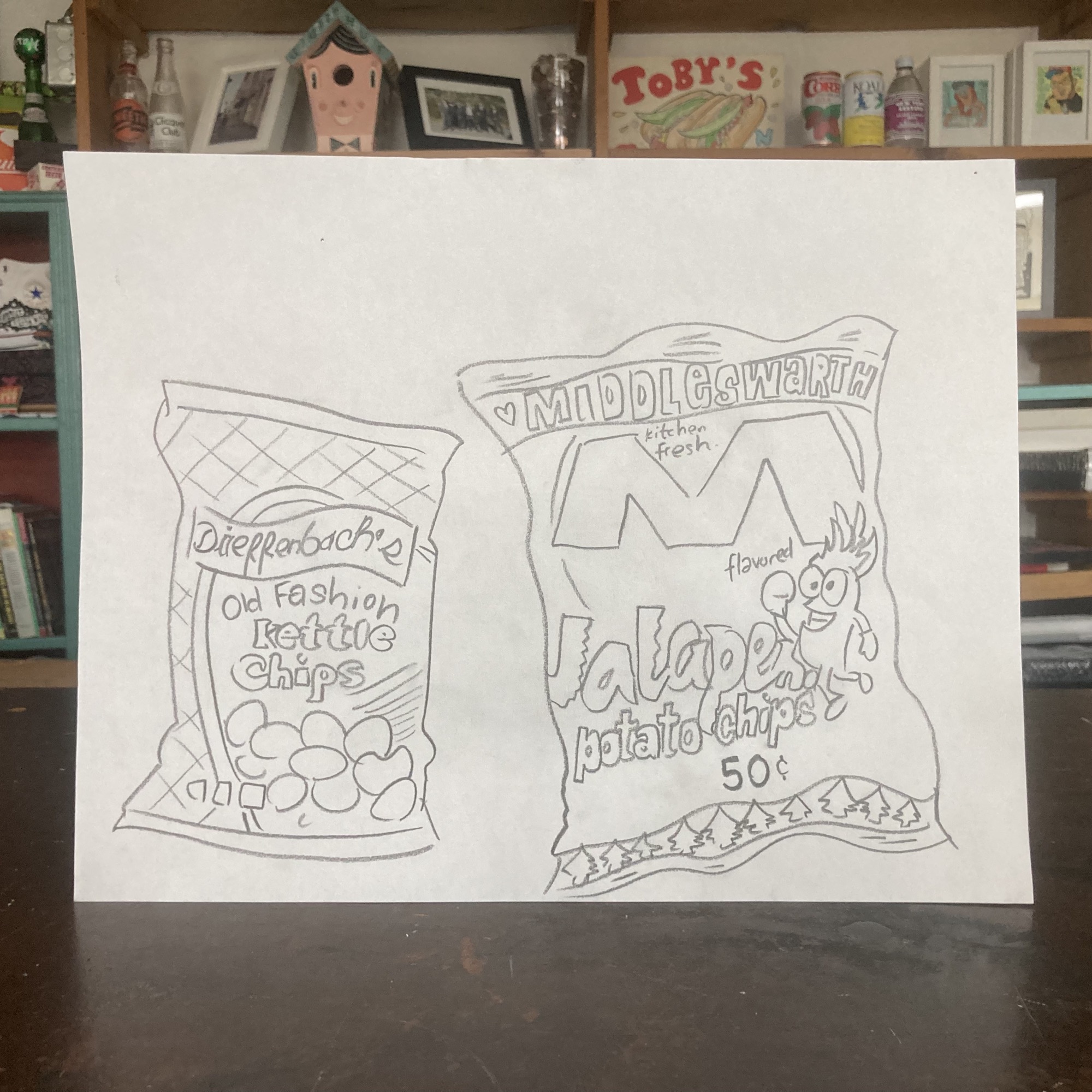 Preliminary sketches for an unpublished "Pennsylvania Chips & Dairy Tea" project.