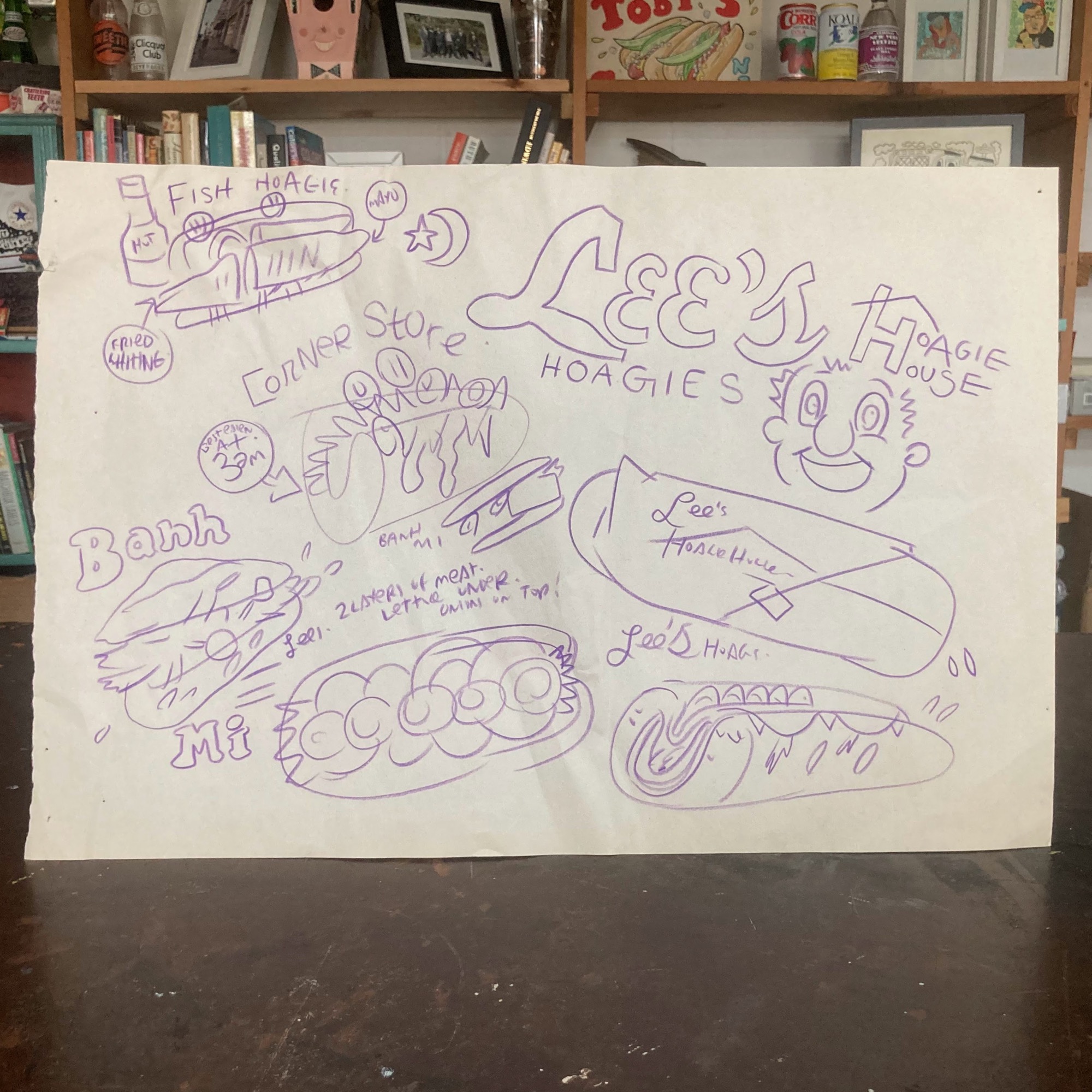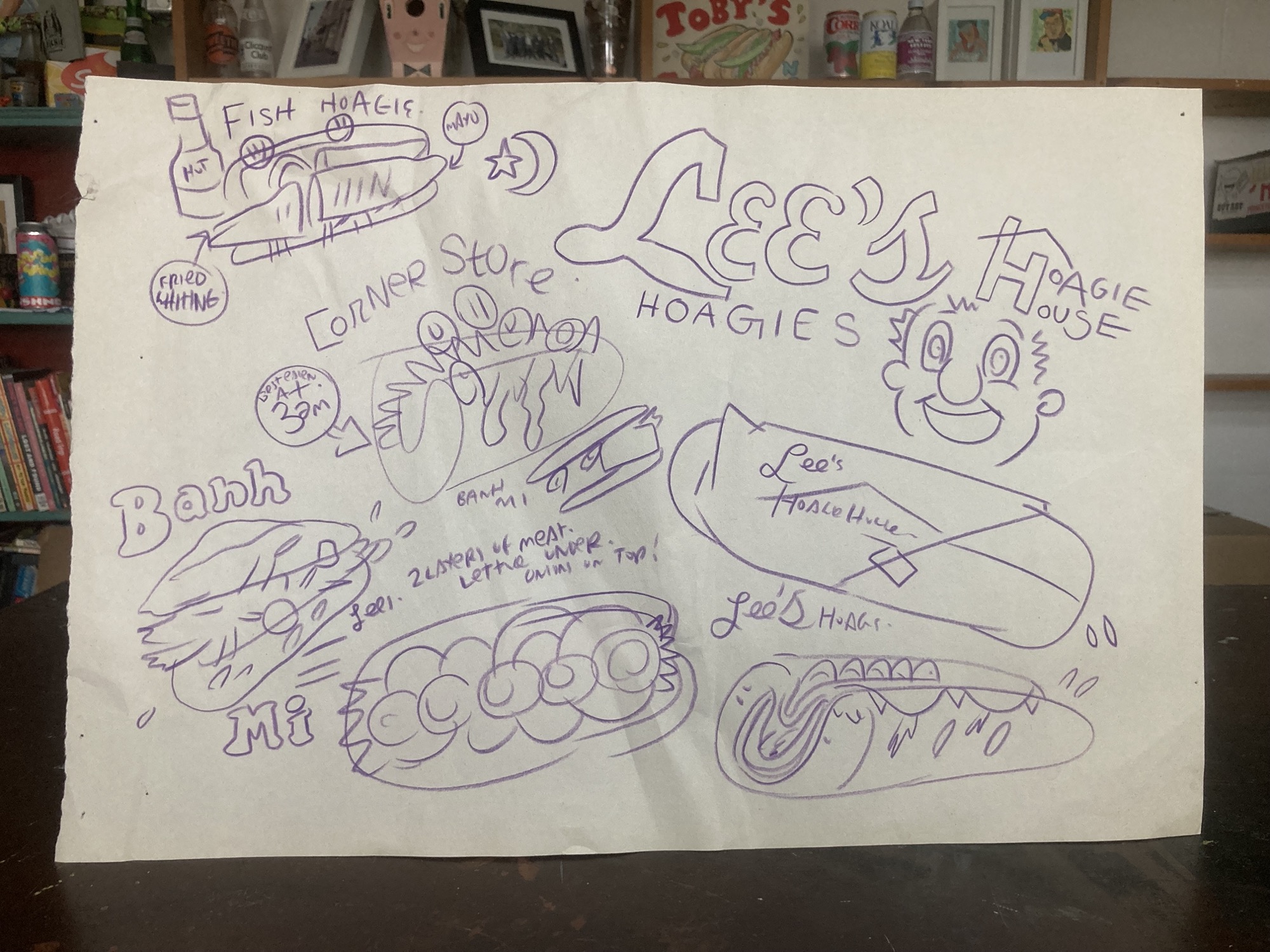 Preliminary sketches for Philadelphia Hoagie Guide print. Includes rough doodles of Fish Hoagie, Banh Mi etc.
