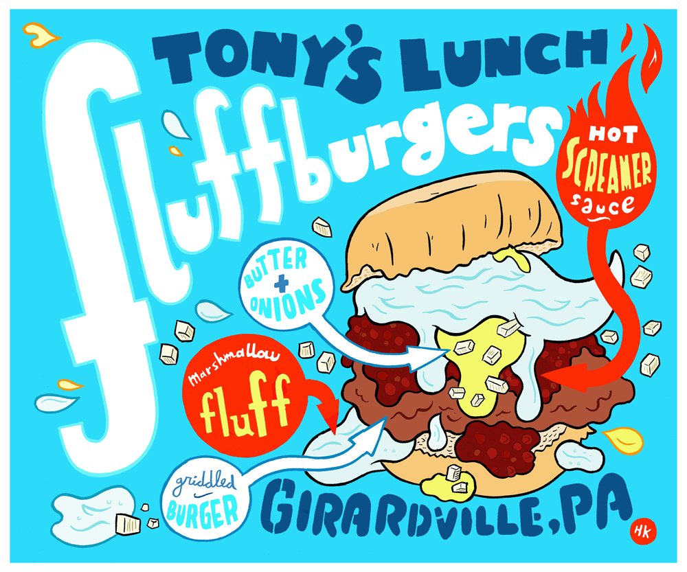 From my Saveur column, "Hawk's Illustrated America" comes this limited edition print of Girardville, PA's semi-infamous Fluffburgers aka "Screamers With Fluff", a crazy coal-country concoction that's been around since the 70's.