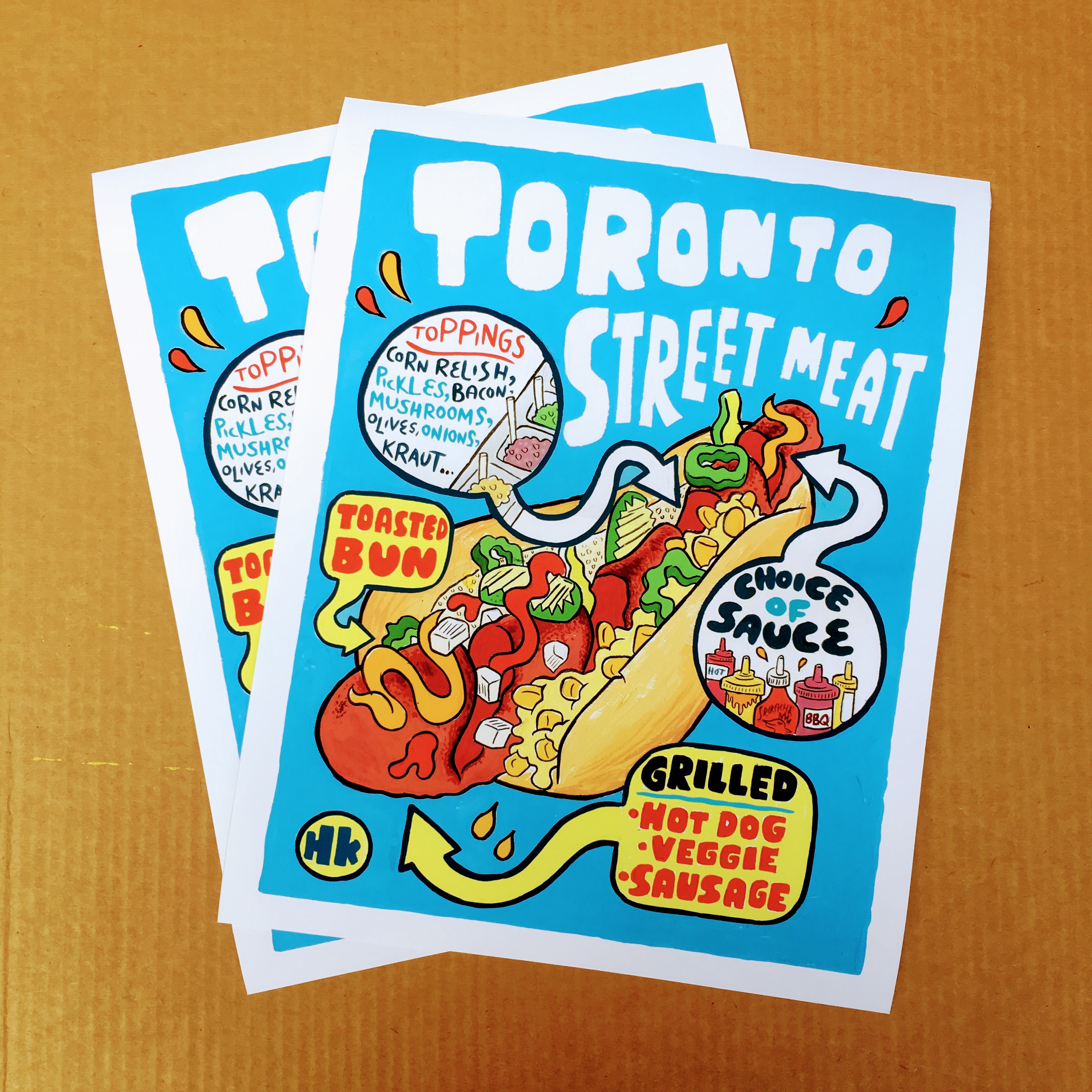 BACK IN STOCK for the first time in a while! From the original hot hog painting series, Toronto's wild, infamous grilled street dogs, topped with any manner of crazy ingredients (yes, even ketchup!!).