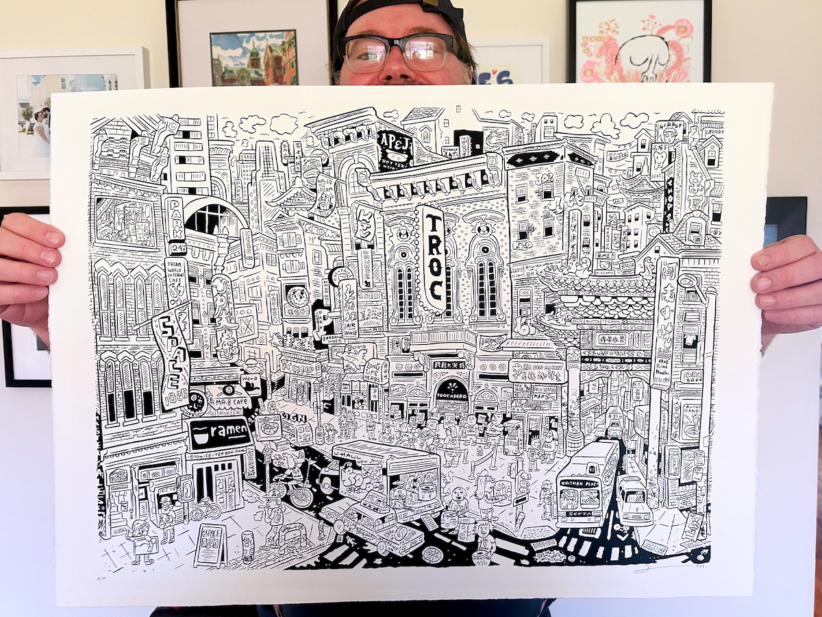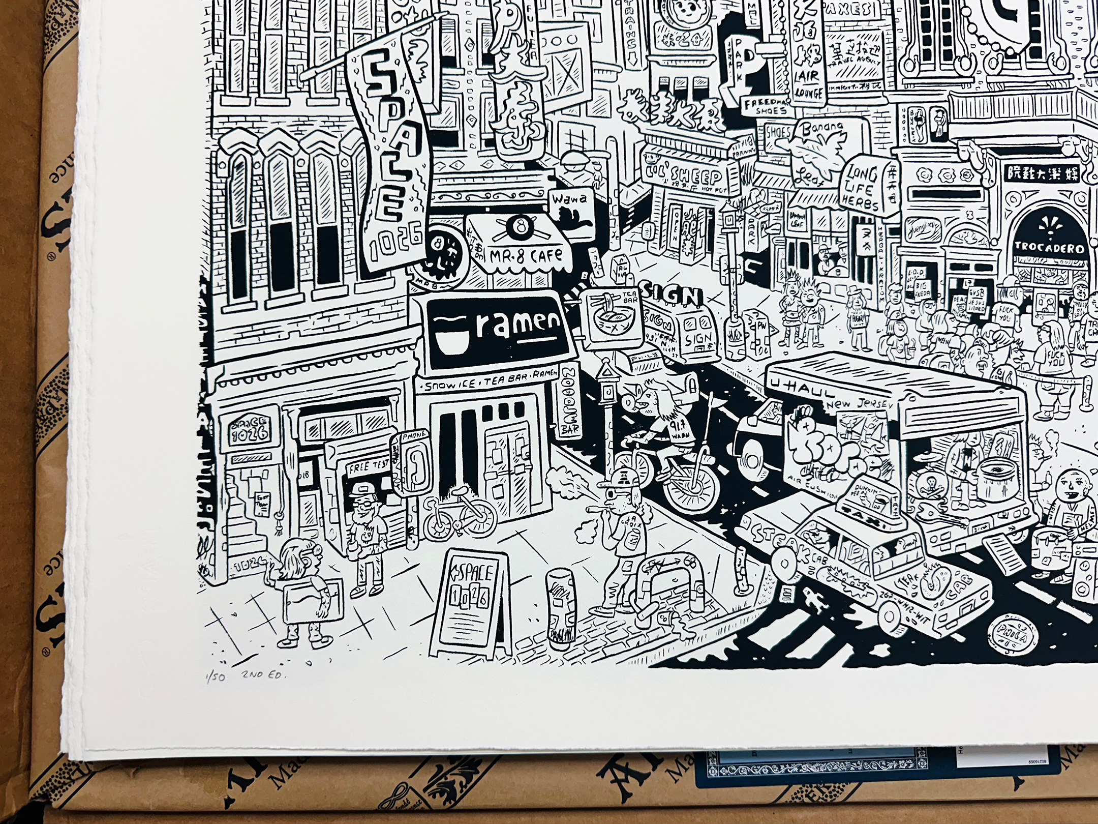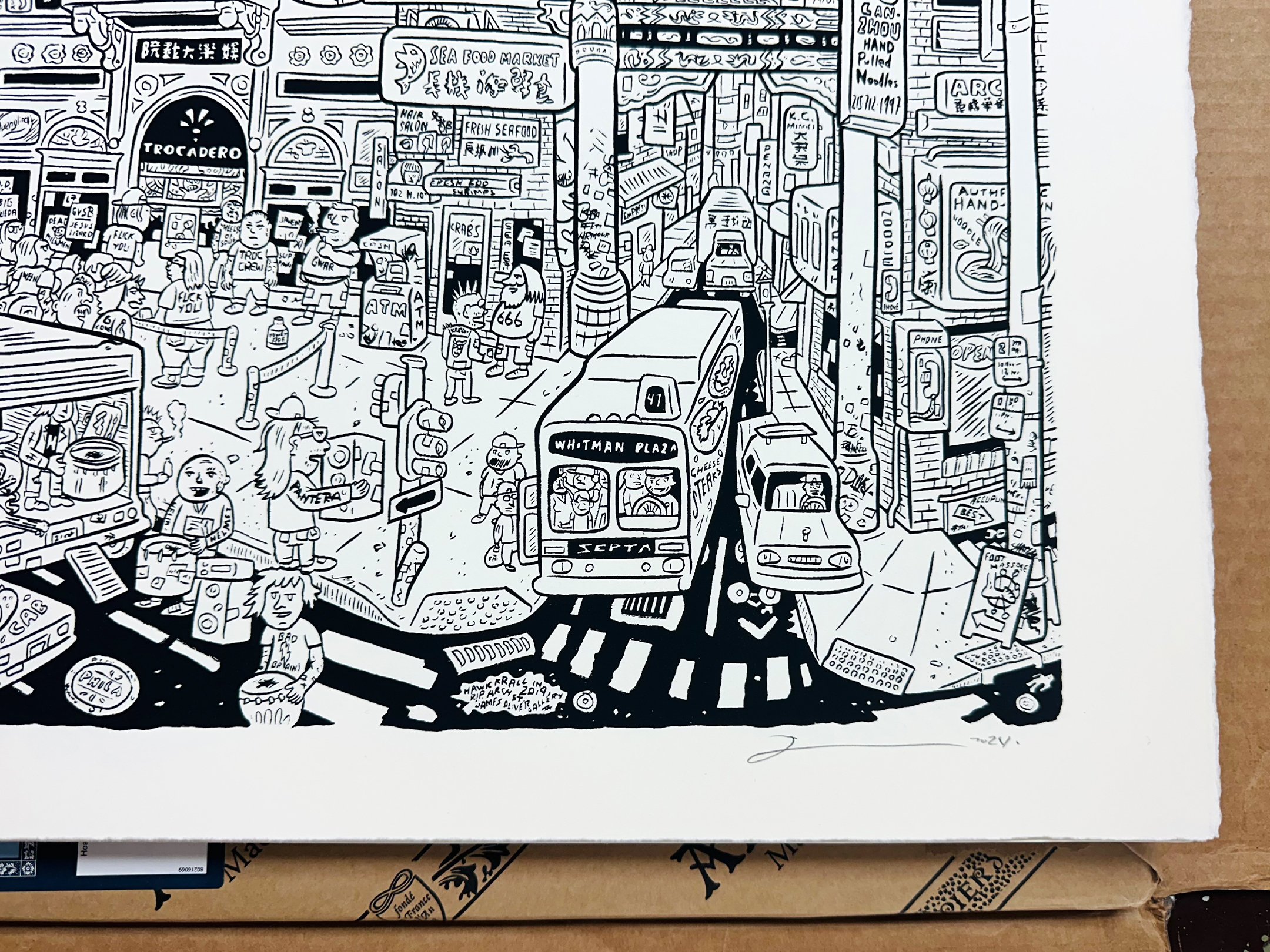 Super crazy detailed scene of Philadelphia's rapidly changing Arch Street / Chinatown block that was (until recently) home to both the best/craziest art venue in the city (Space 1026) and the best/craziest music venue, and former burlesque house the Trocadero.