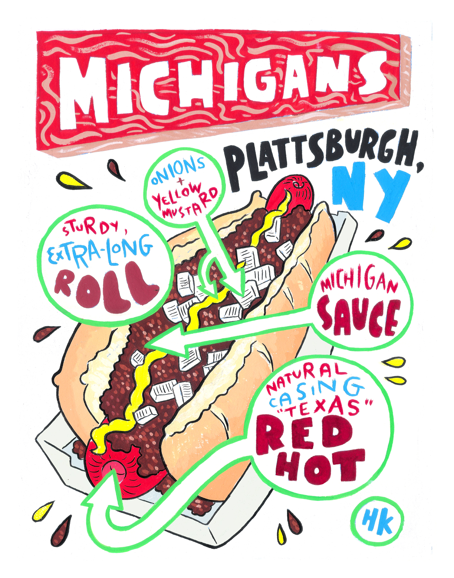 Plattsburgh, New York is famous for Hot Dogs called... "Michigans" covered in "Texas" sauce!