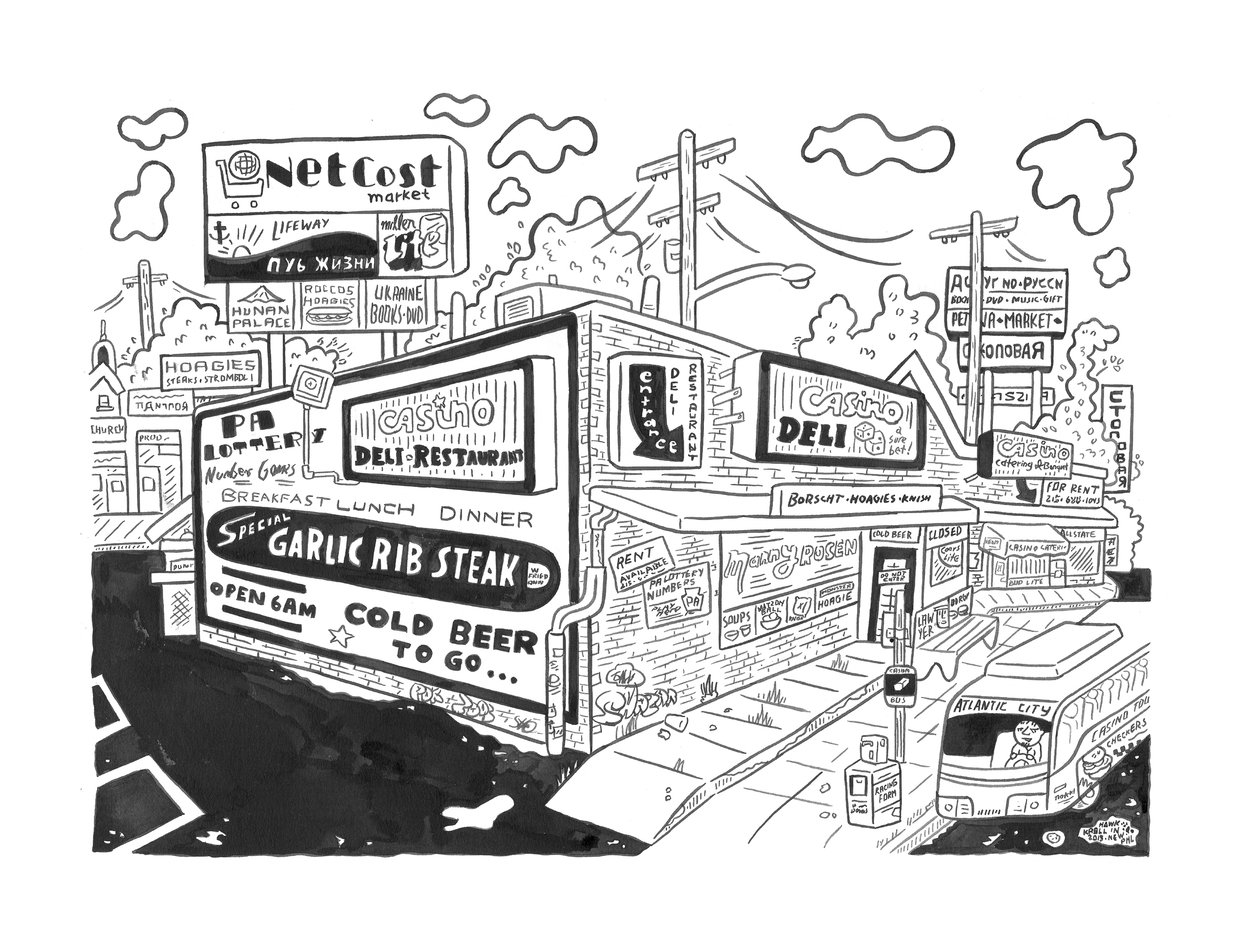 Originally drawn in 2015 for "The New Philadelphia" solo exhibit at Moore College Of Art. Reprinted by request, slightly updated to correct the Cyrillic lettering.