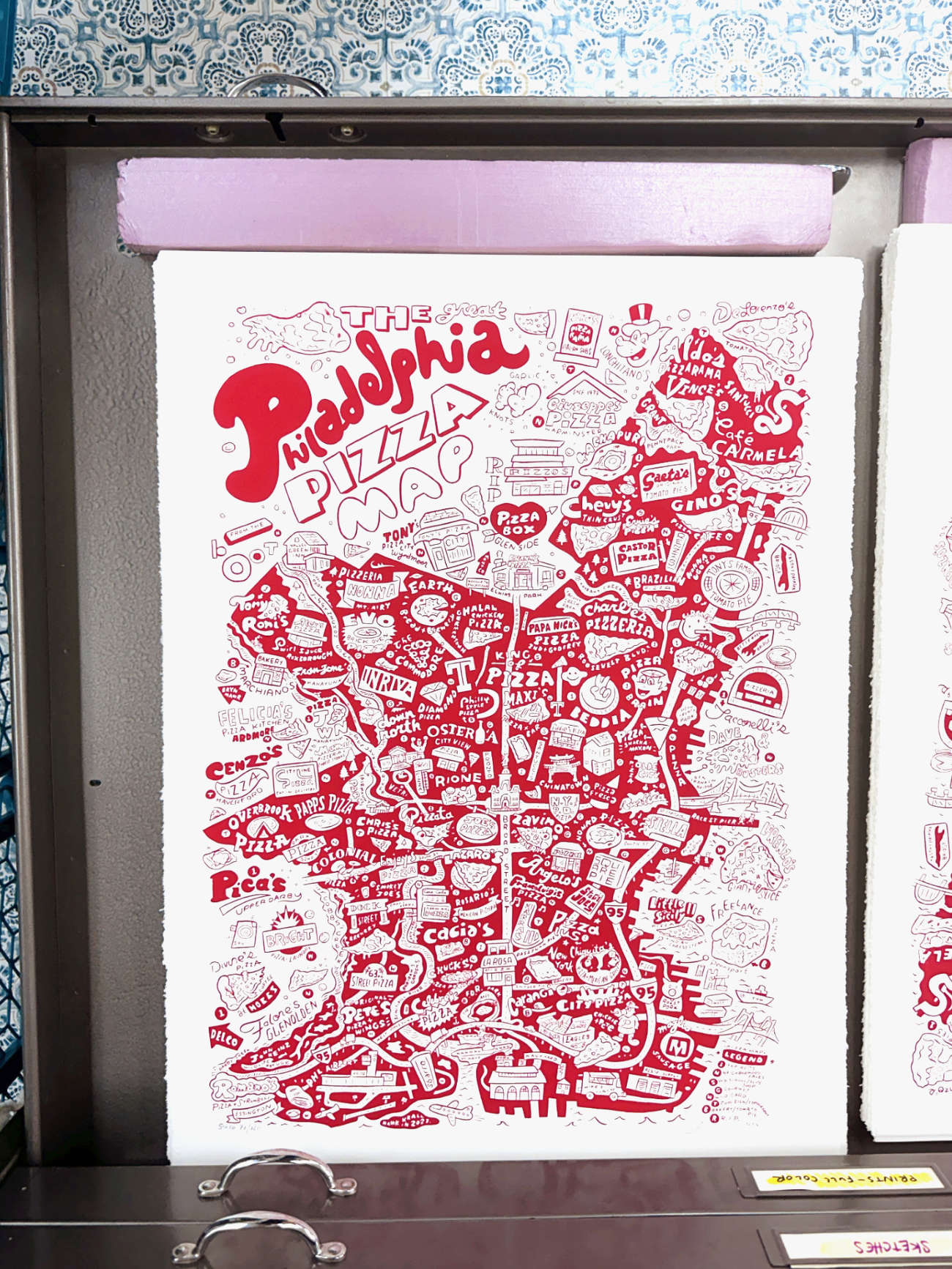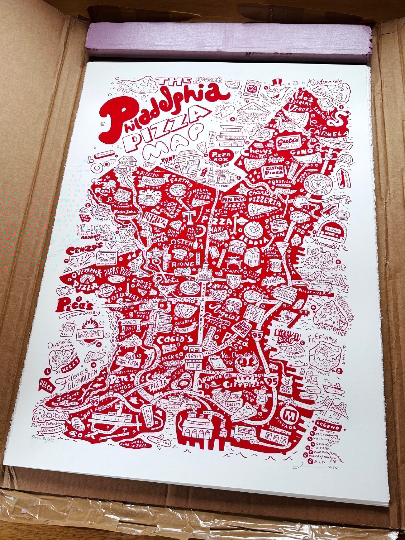 BIG 22" X 30" one color screenprints printed by Ralph Stollenwerk on Stonehenge white printmaking paper. Super detailed map of Philadelphia Pizza places chock full of all the faves. Originally a private commission from 2019 (before COVID), so the places featured reflect that time period.