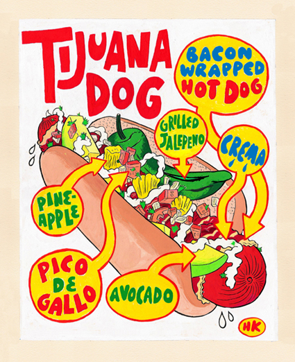 BACK IN STOCK for the first time in a while! One of the first few hot dog paintings and prints I did wayyyy back in 2009; the now classic LA Mexican "Tijuana" street dog.