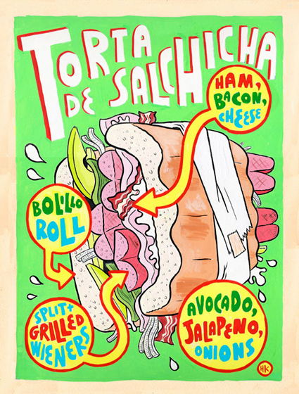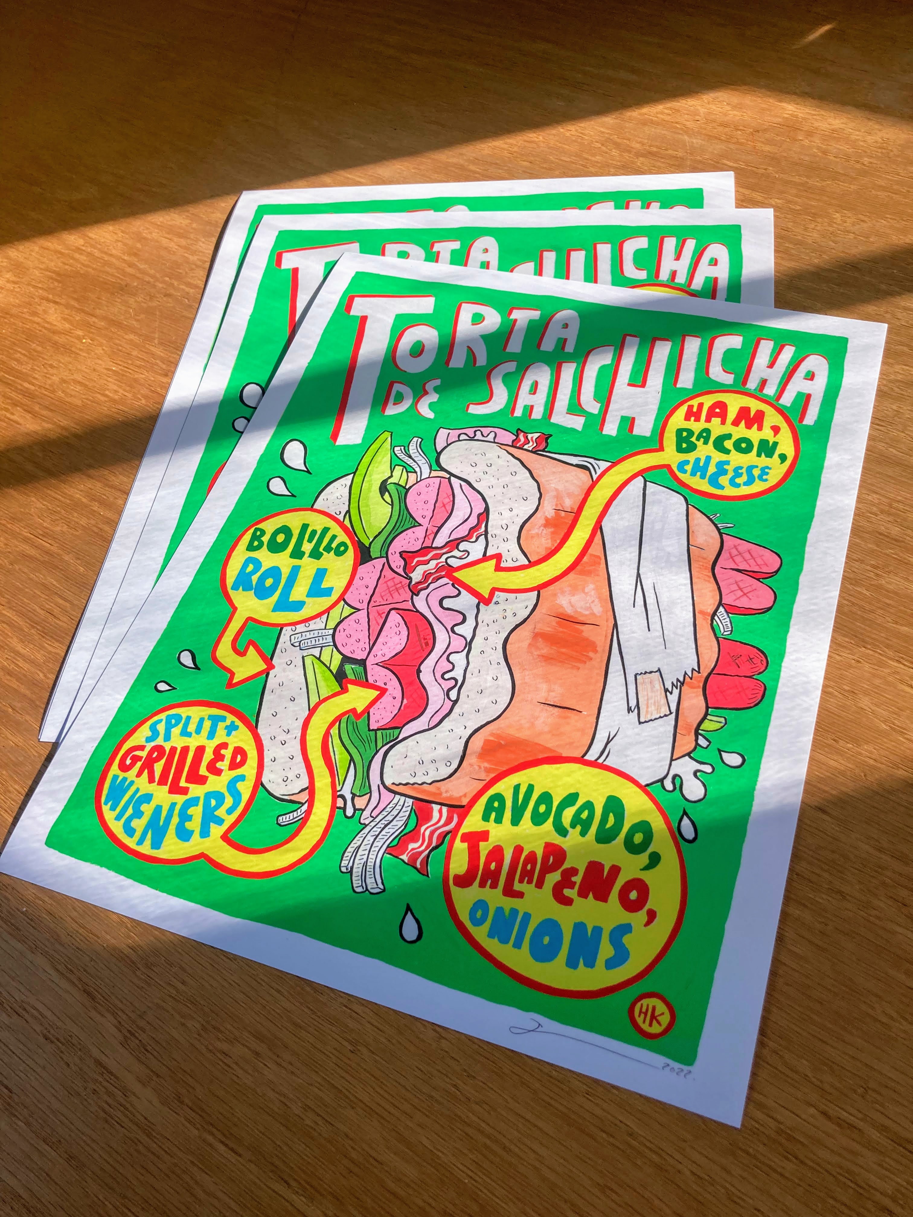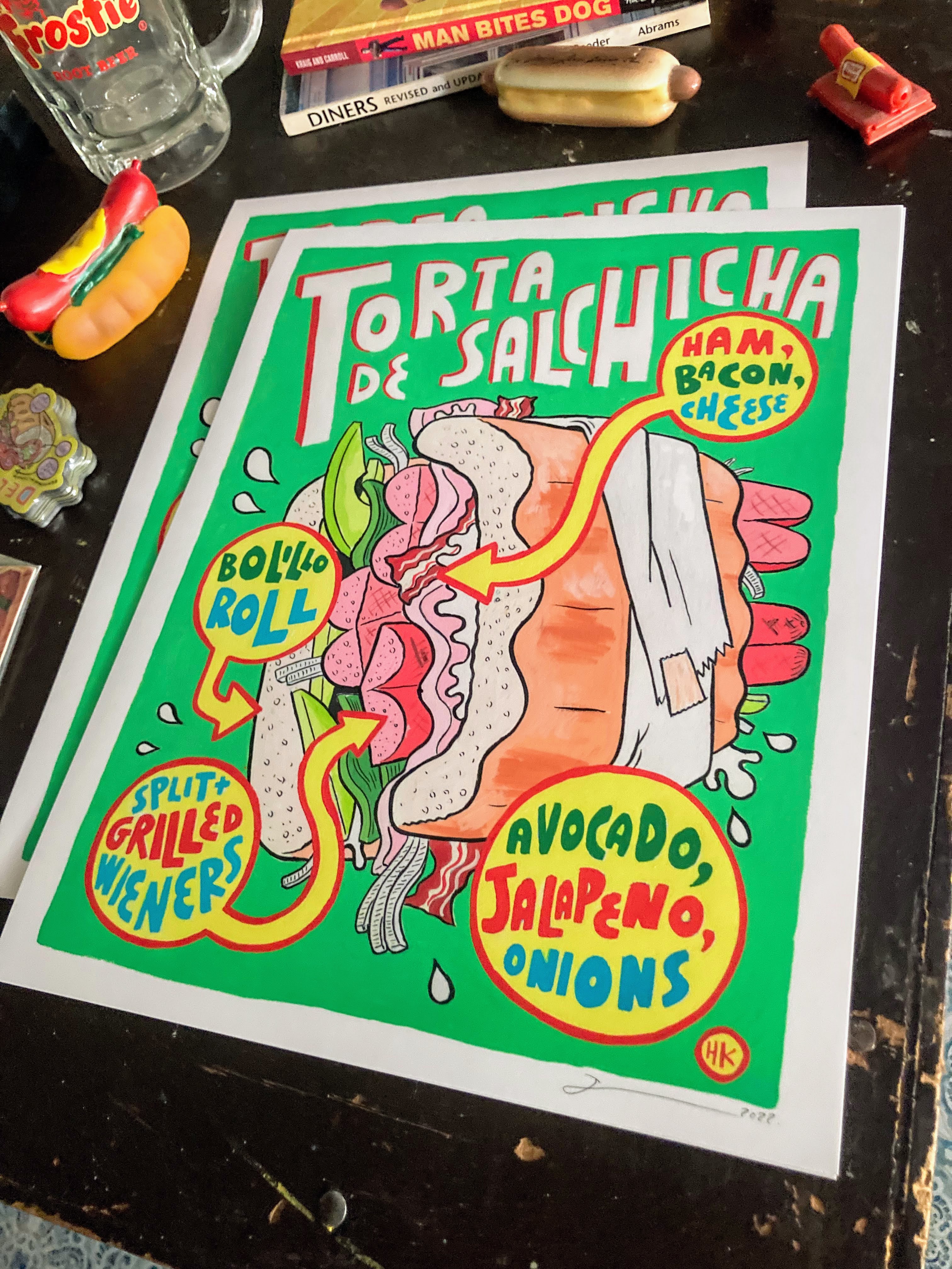 BACK IN STOCK for the first time in a while! From the original hot dog painting series.. an amazing Mexican Hot Dog Torta from Puebla Mini Mart in Brooklyn in the mid 2000's.