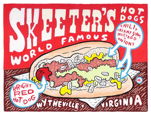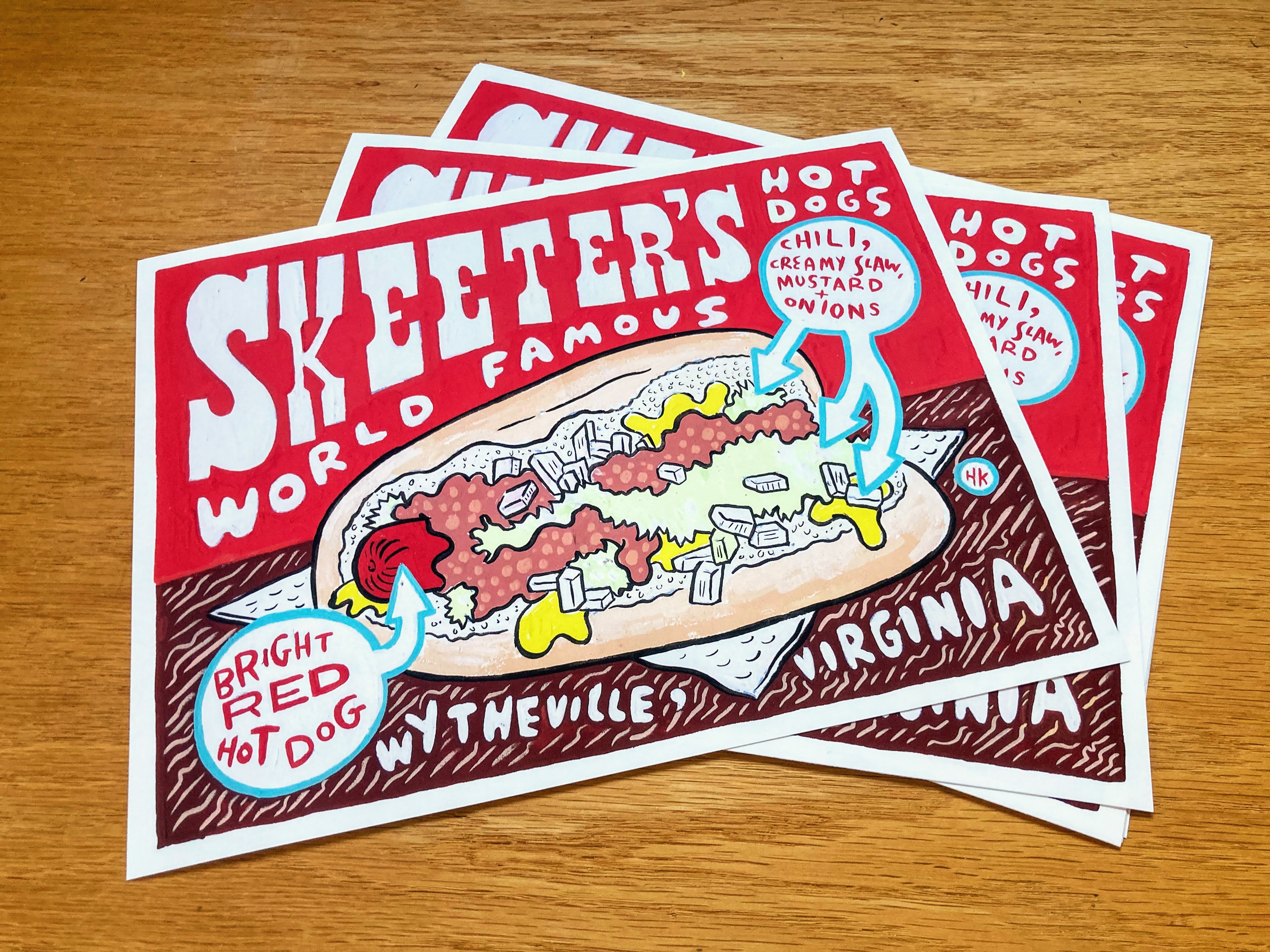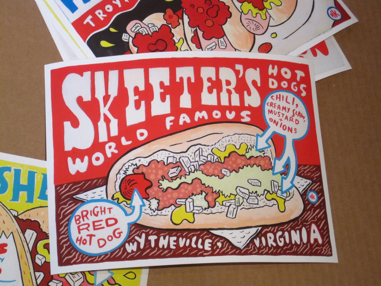 BACK IN STOCK for the first time in a while! From the original hot dog painting series, Skeeter's E.M. Umberger store is a must-stop on any road trip through Virginia, just a few miles off of I-81. This counter-luncheonette has been around since 1925, famous for its slaw dogs.