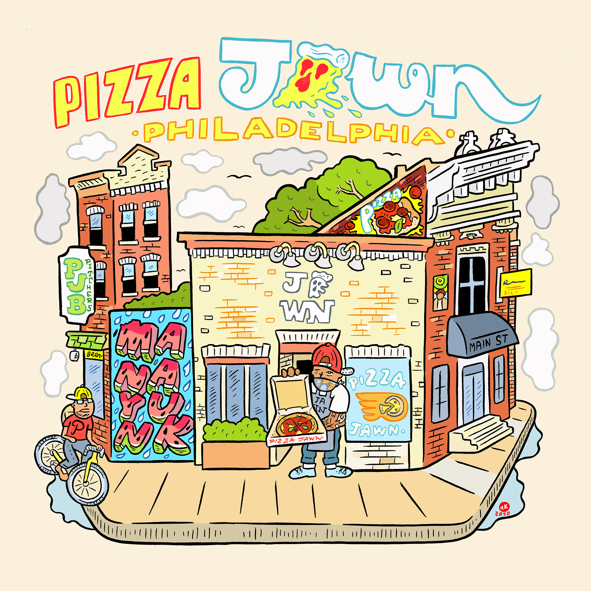 Storefront view of Philadelphia's legendary pop-up turned brick and mortar PIZZA JAWN along main street in Manayunk.