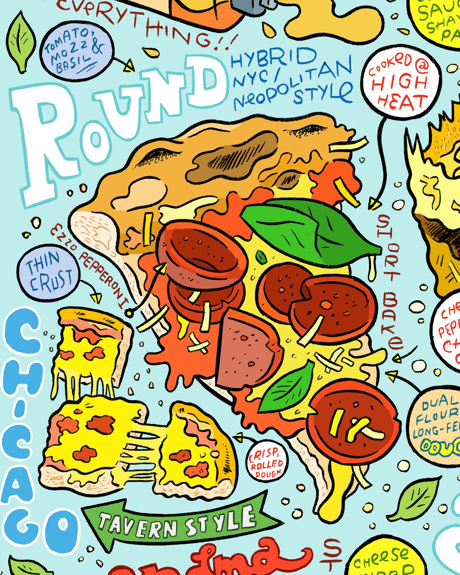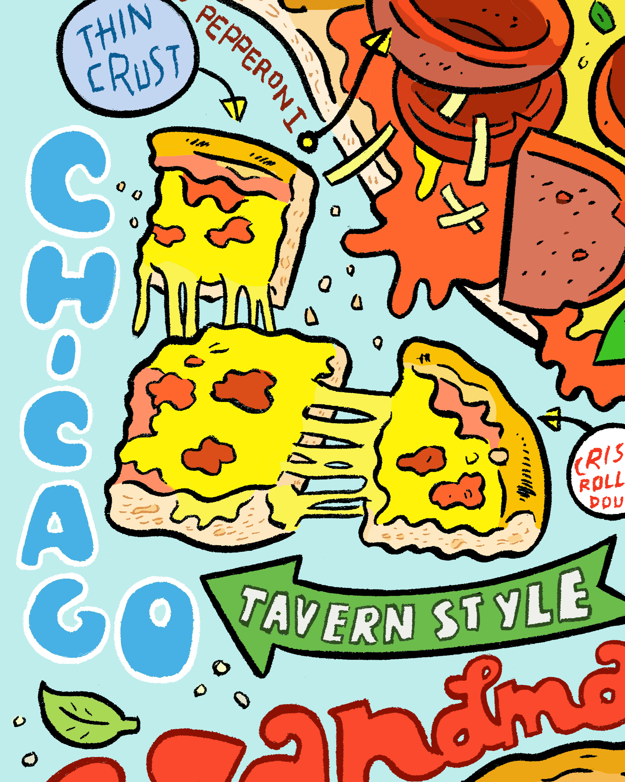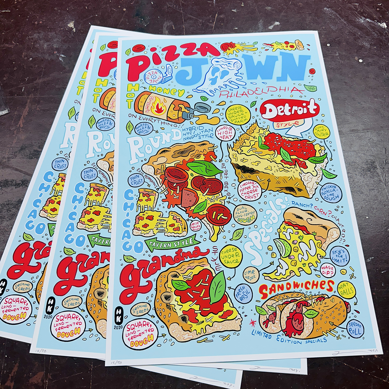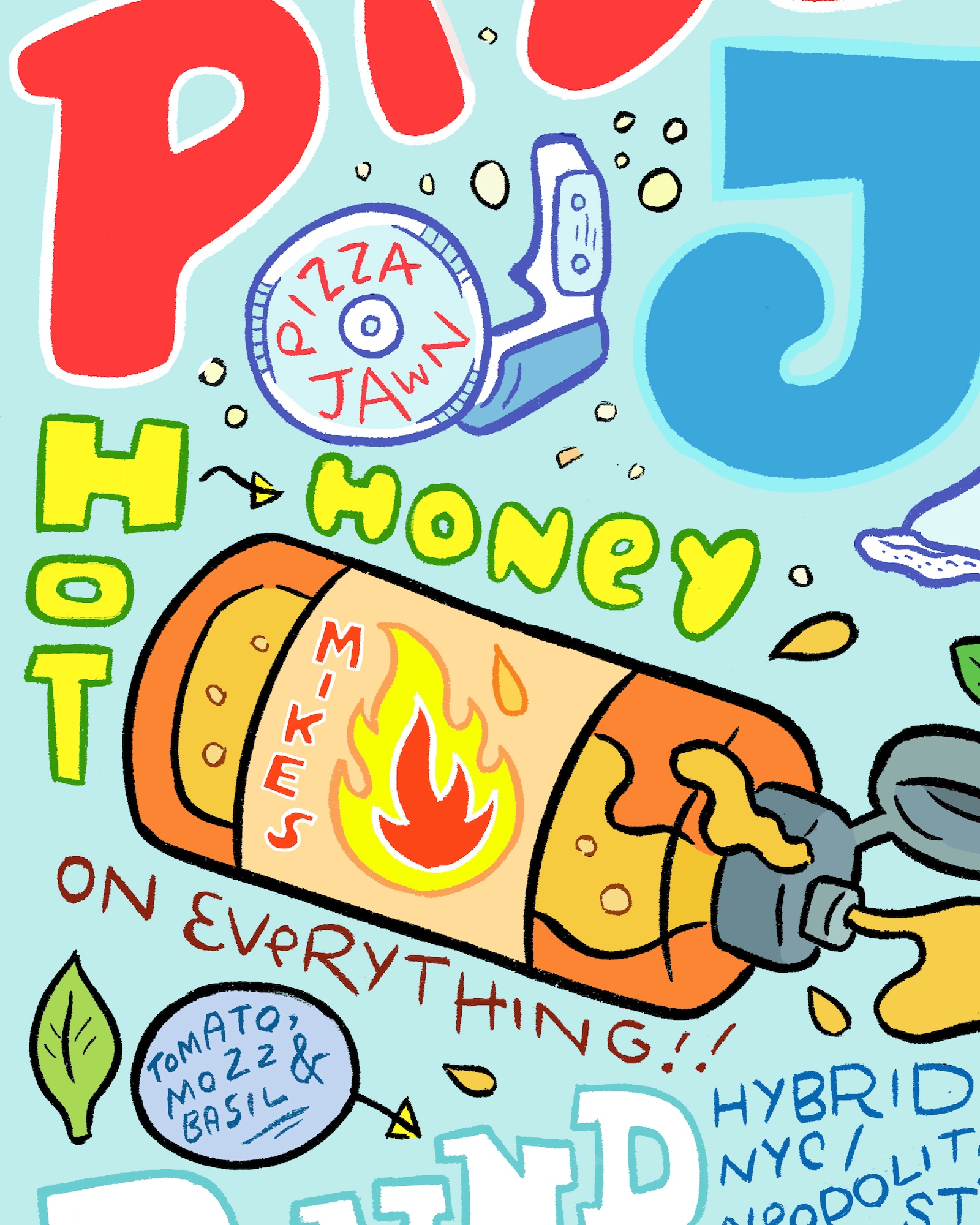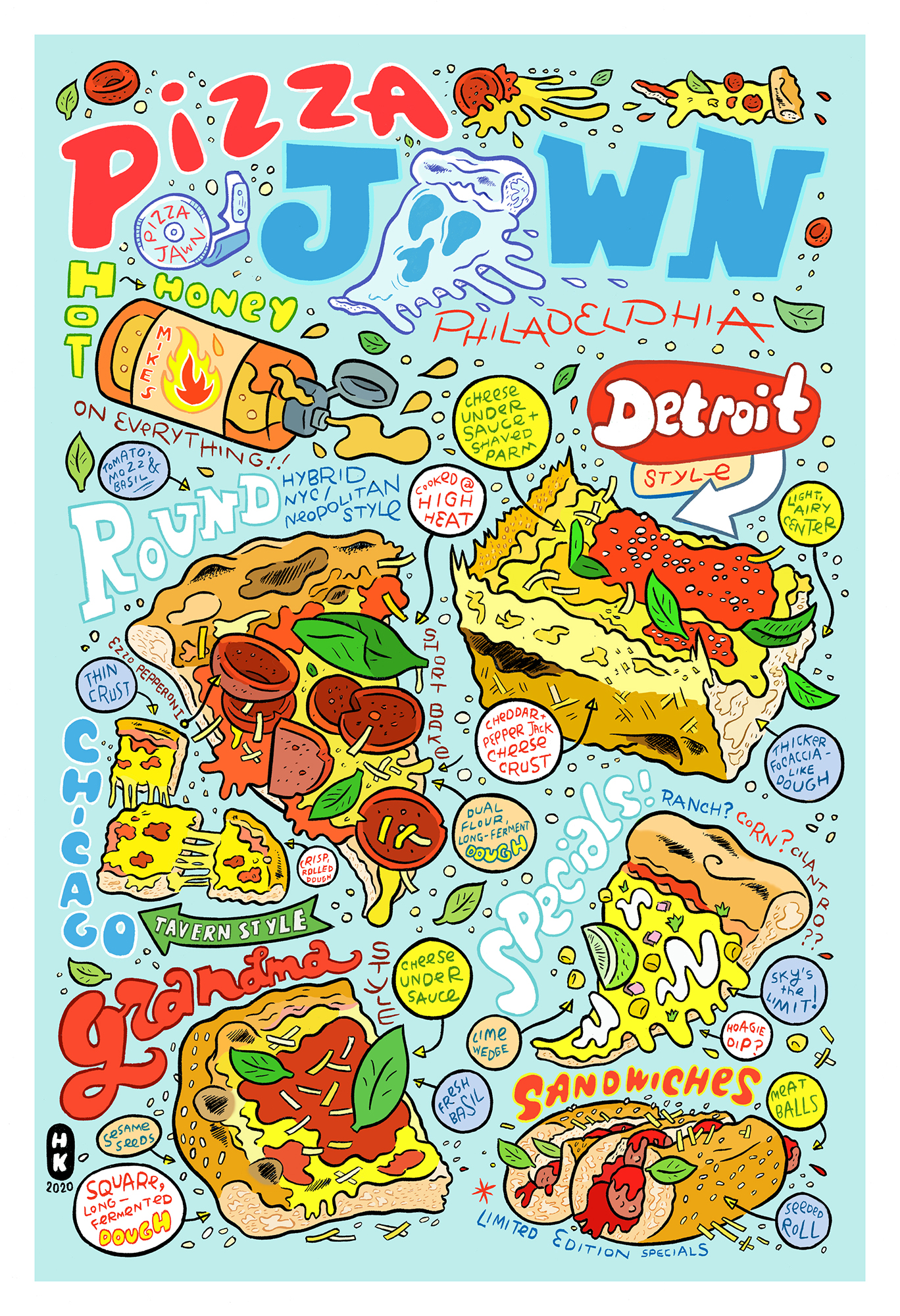 Poster-sized print featuring Philadelphia pop-up turned brick and mortar PIZZA JAWN's extensive menu of regional Pizza styles, sandwiches and specials.