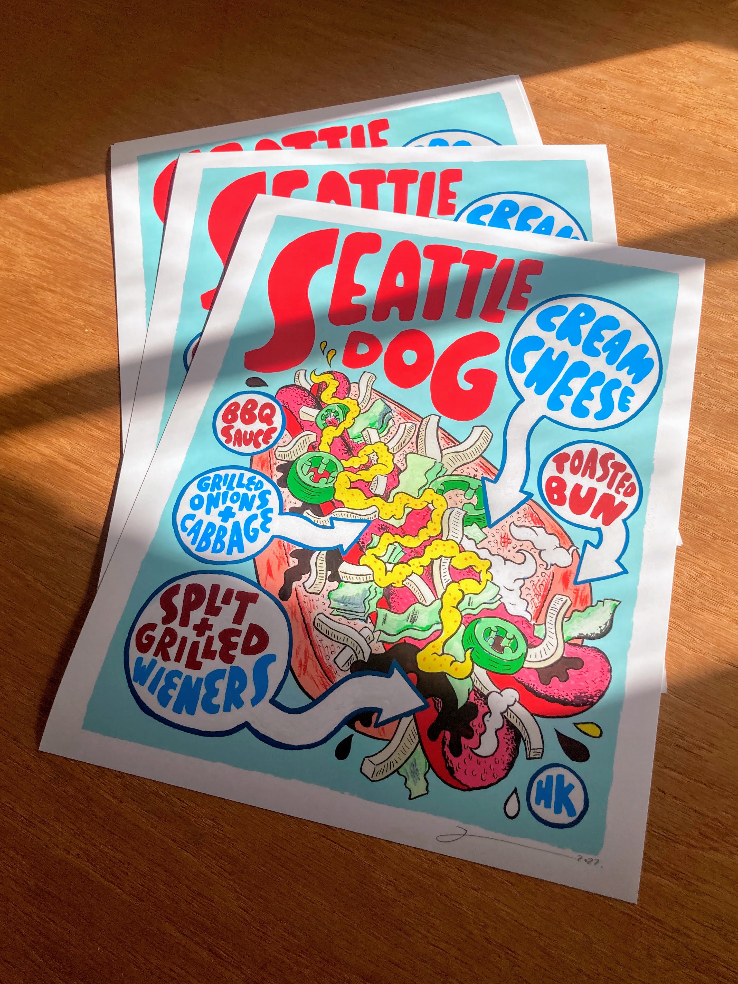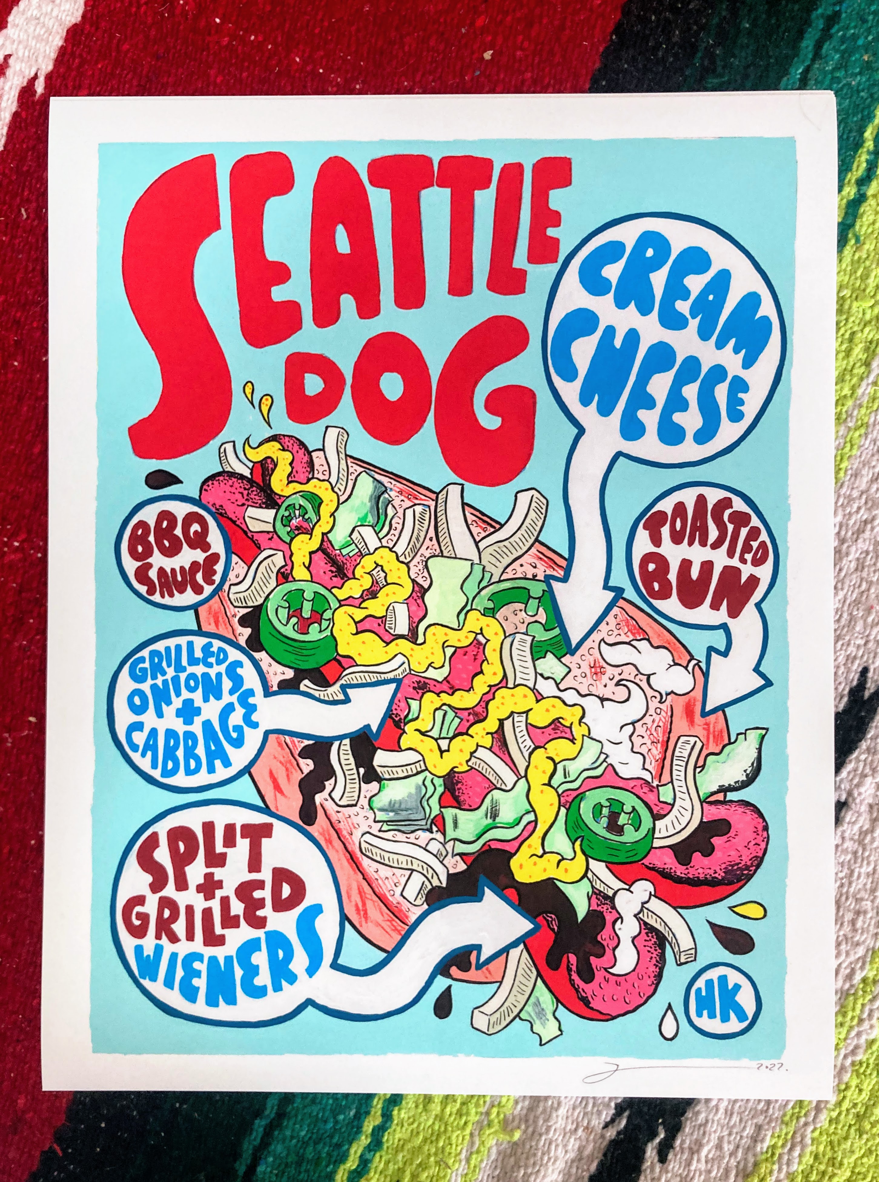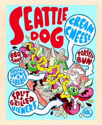 BACK IN STOCK for the first time in a while! From the original hot dog painting series, Seattle's INFAMOUS cream-cheese and coca-cola fried onion hot dog.