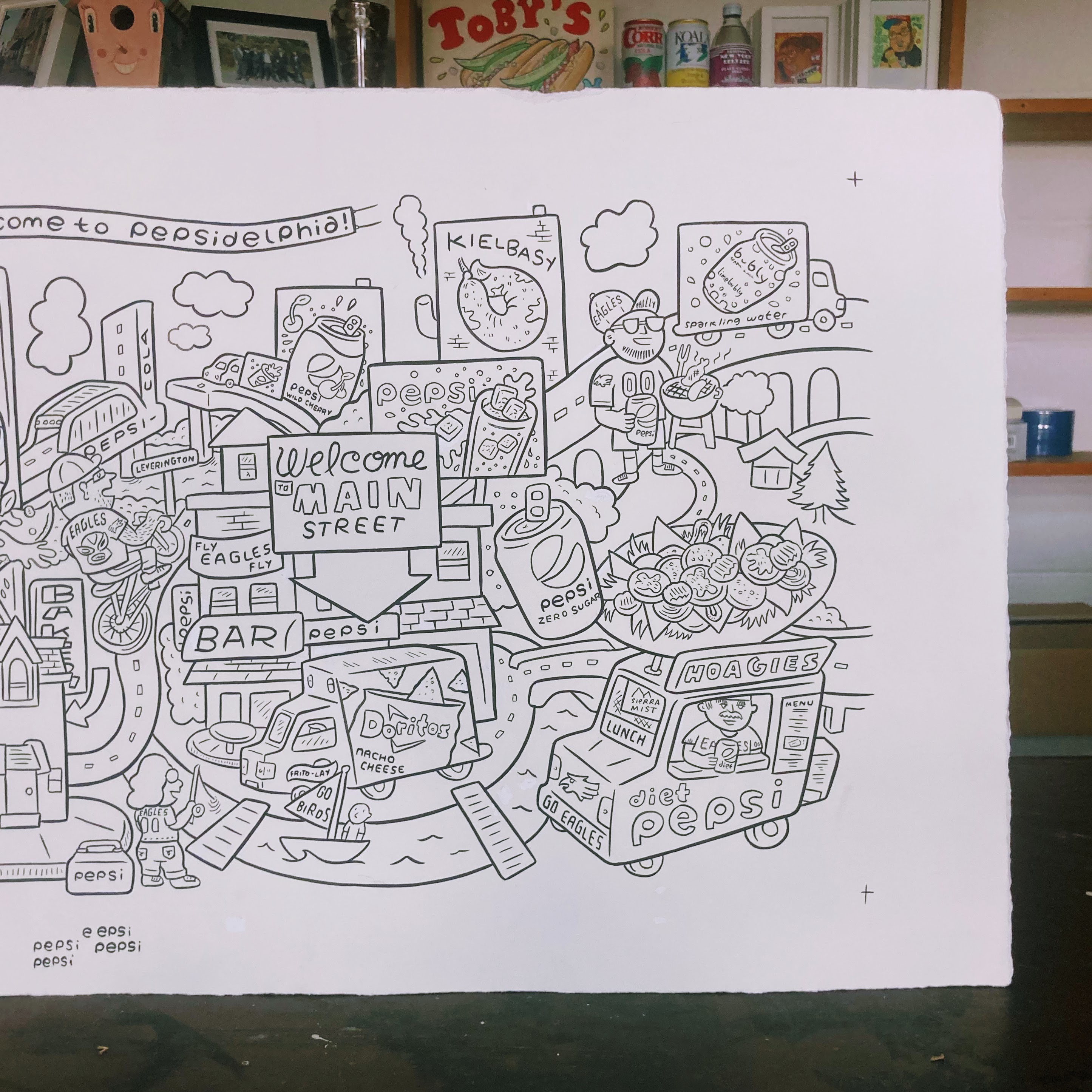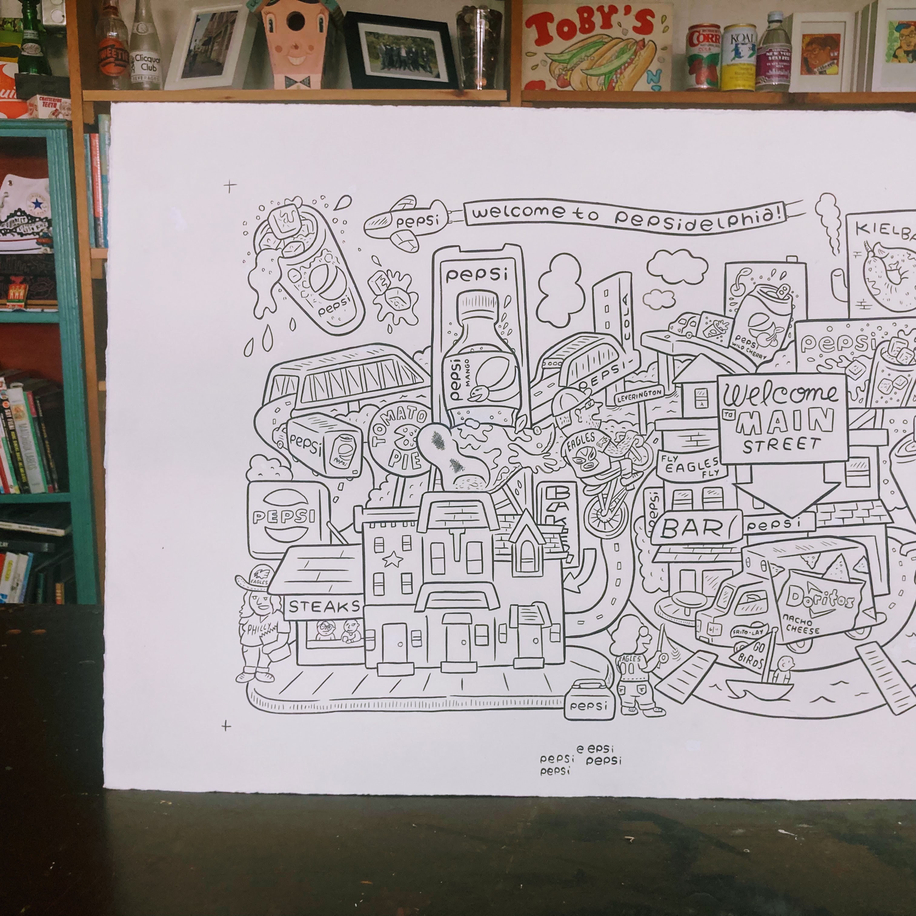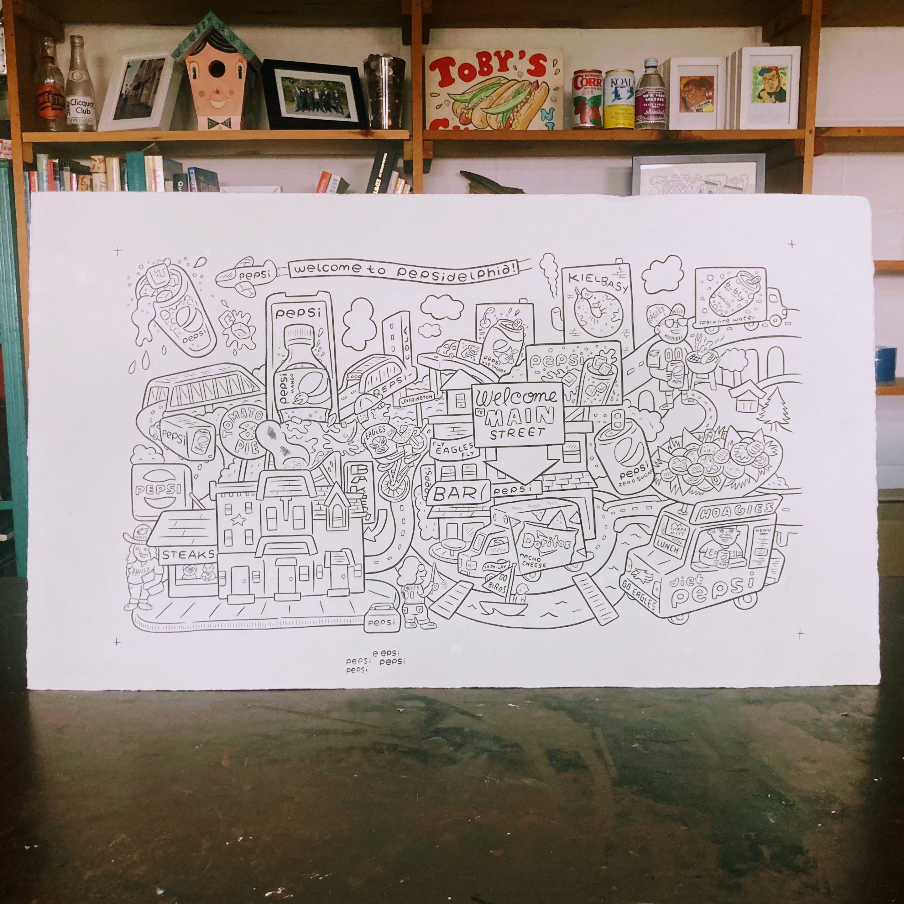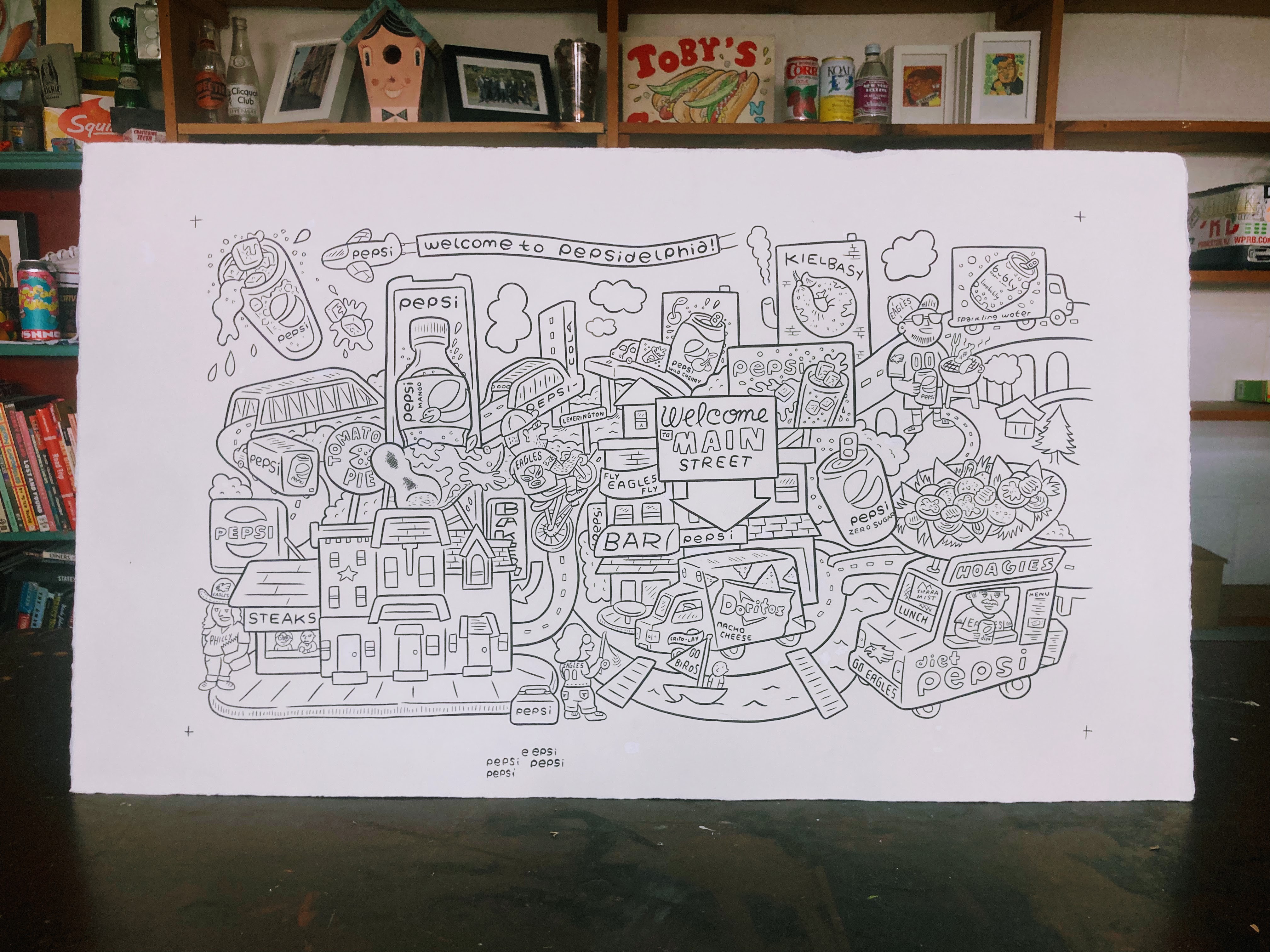 Artwork for PEPSI / EAGLES mural at Lincoln Financial Field. The artwork was scanned & colored digitally, then printed on mesh for installation.