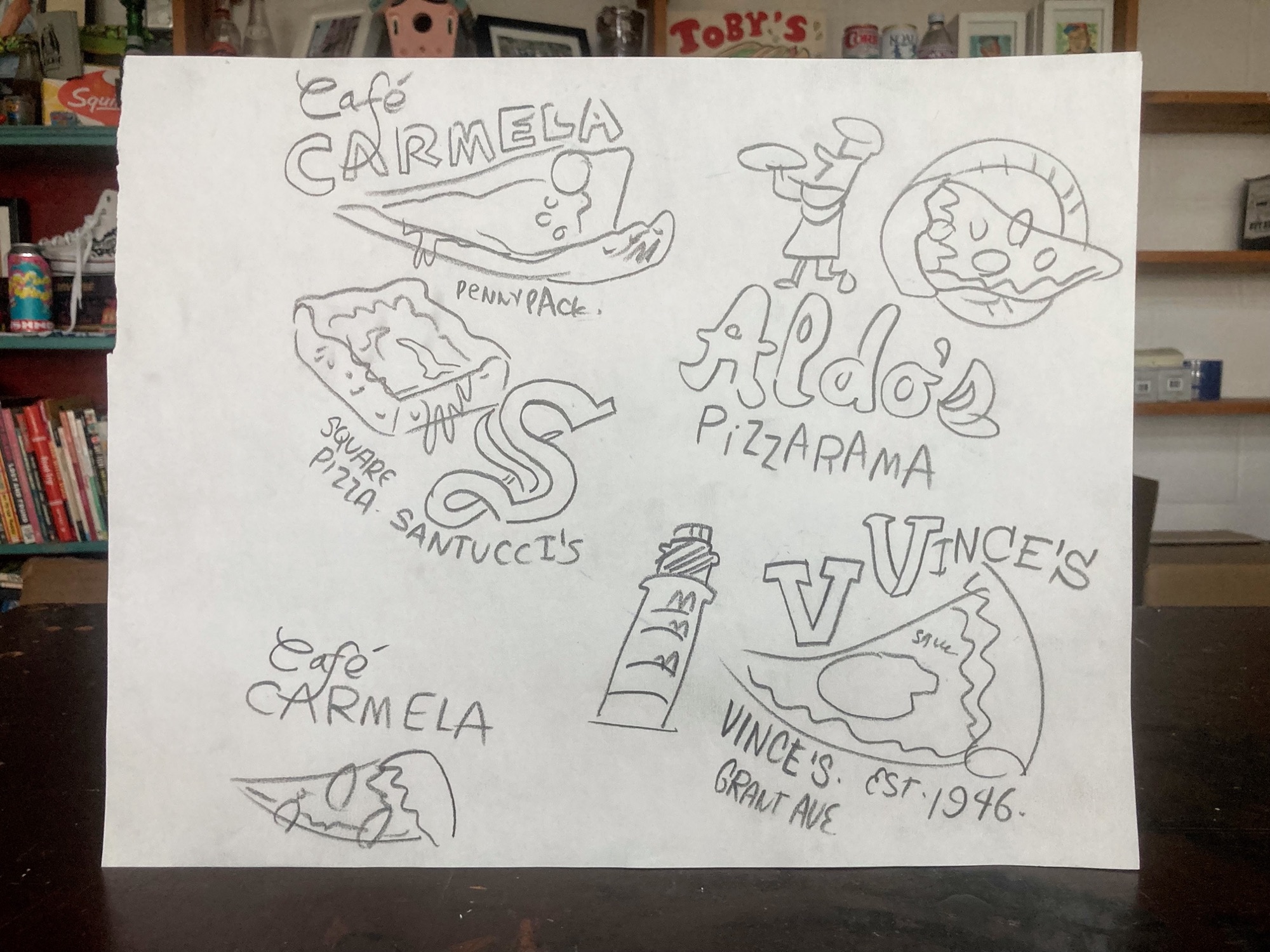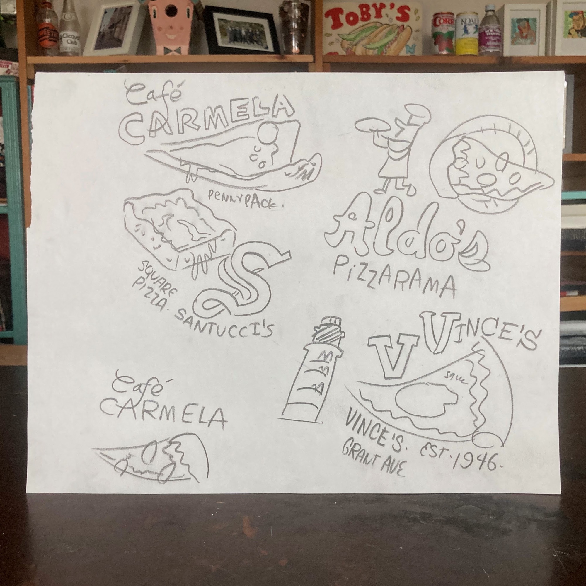 Check the store for more of these! Rough doodles of Aldo's, Vince's, Cafe Carmela and Santucci's.