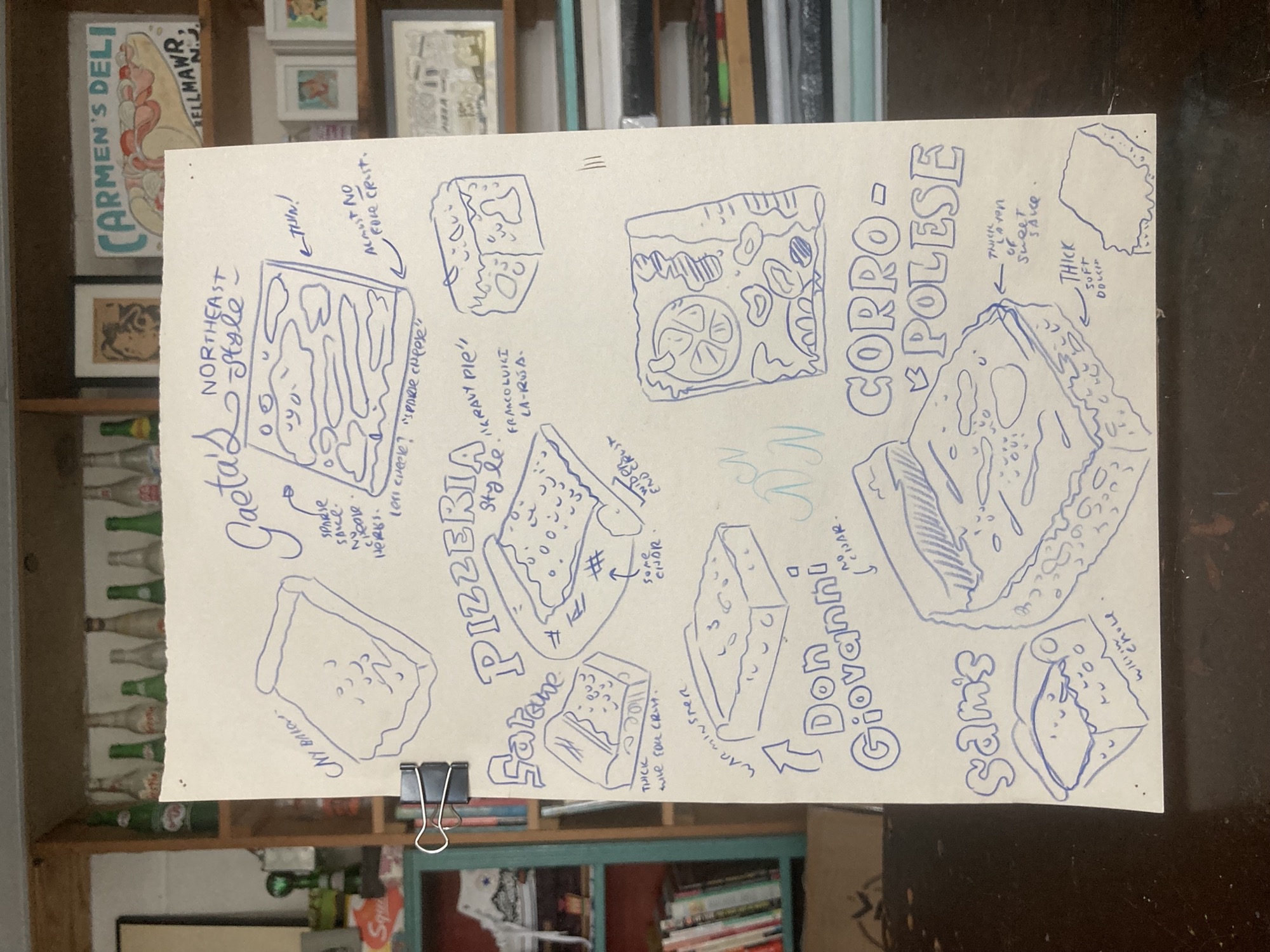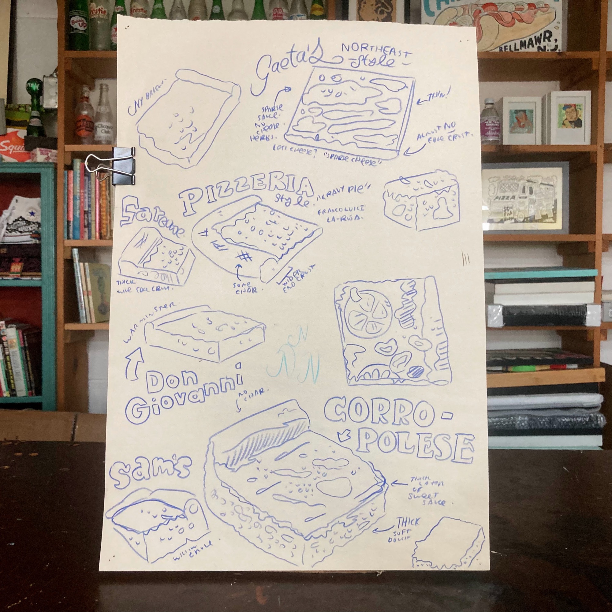 Preliminary sketches for Philadelphia Tomato Pie Print. Includes rough doodles of Sam's, Don Giovanni, Sarcone's, etc.