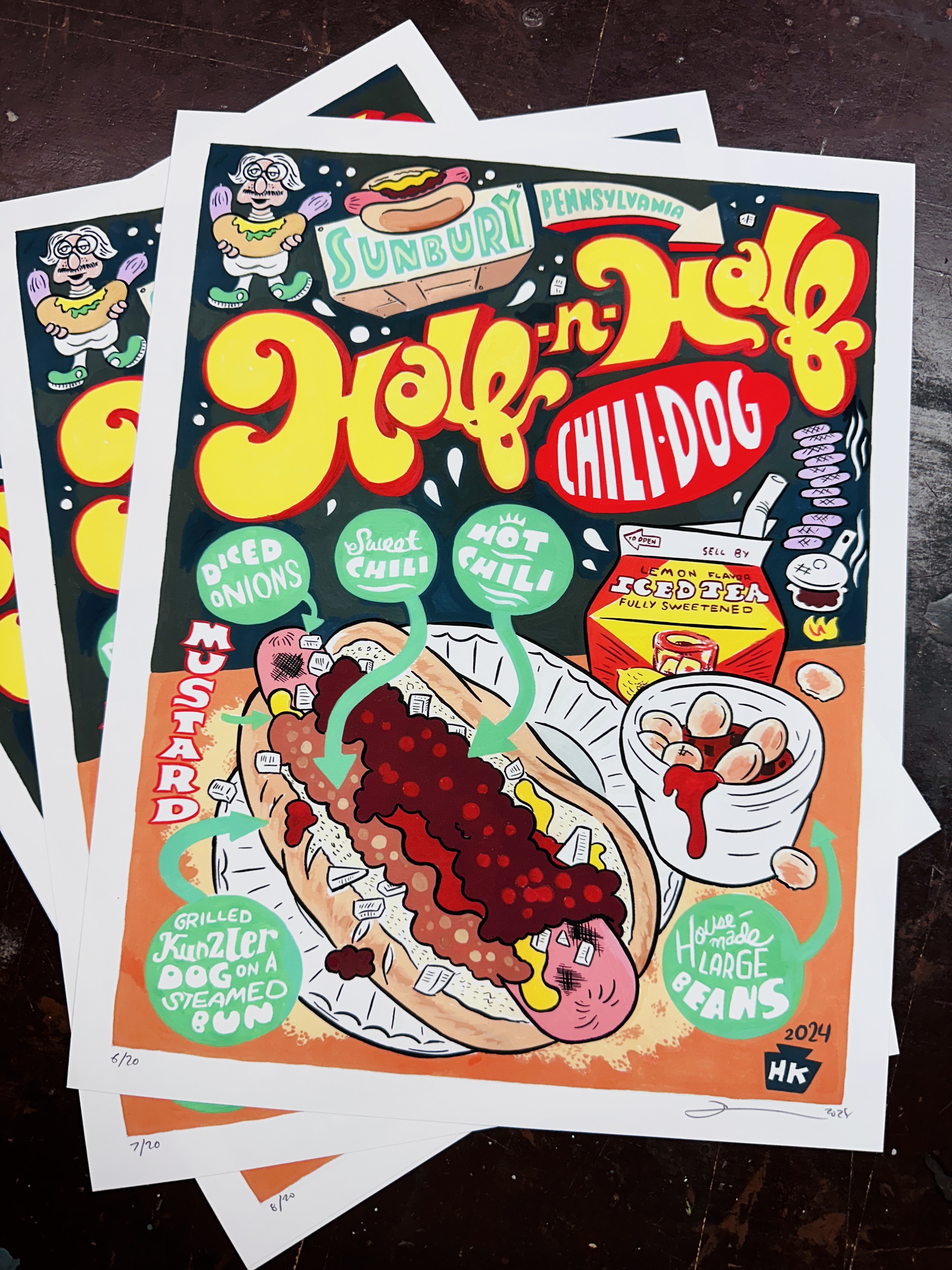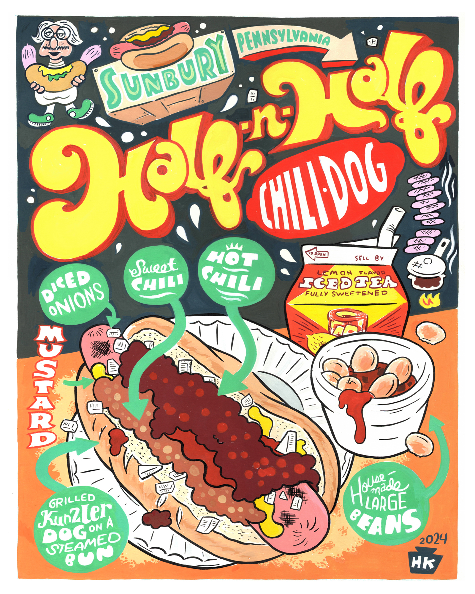 BRAND NEW for 2024! Sunbury Pennsylvania's classic HALF AND HALF DOG. I finally stopped in at The Squeeze In- a tiny old-school Central PA hot dog stand with only 5 seats, and was blown away. I've never quite seen anything like this- two distinct chili sauces lined up on the same dog. One sweet, one super spicy, plus onions and mustard buried under the dog.